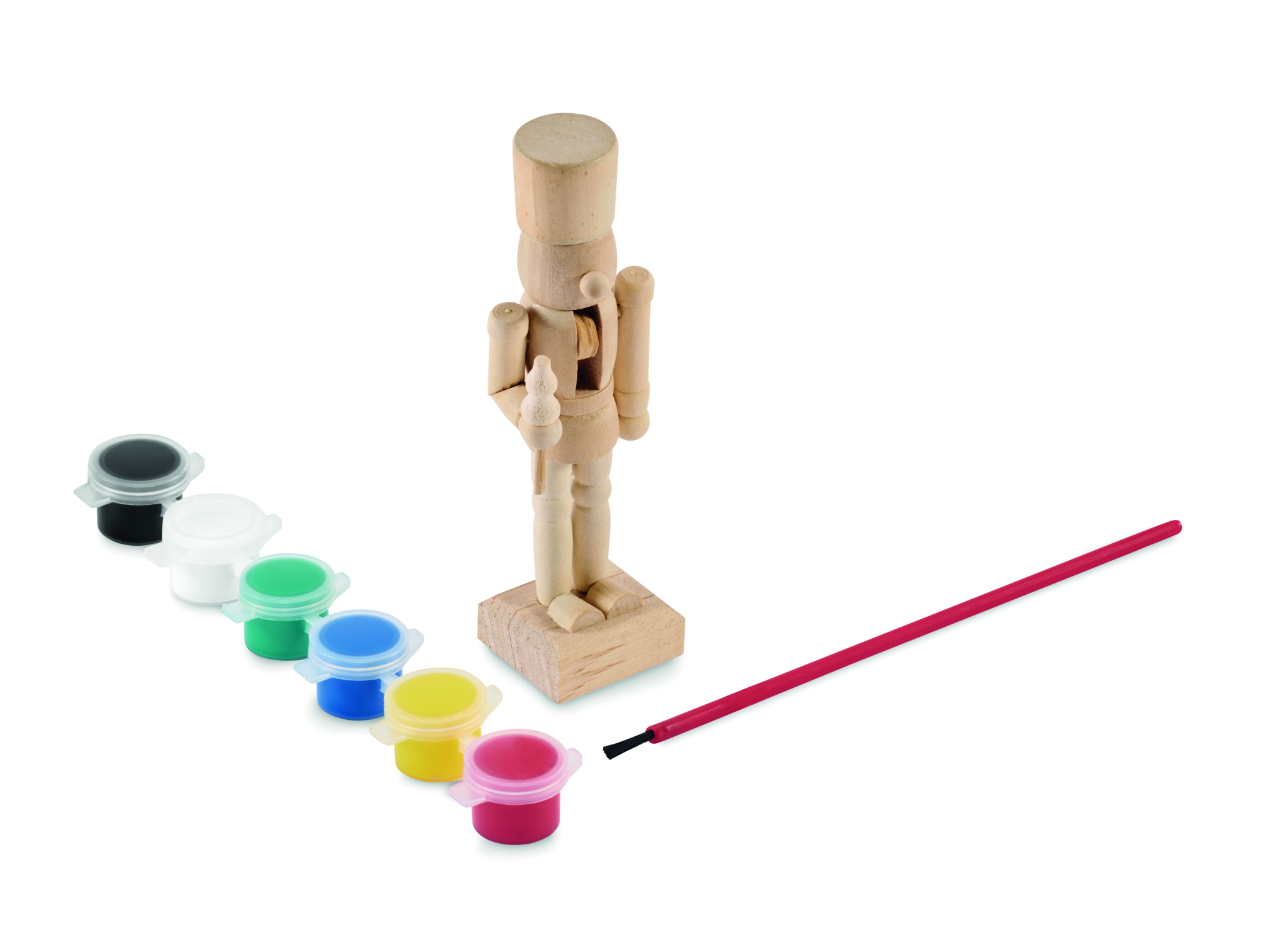 Maalaussetti, jossa on pähkinänsärkijähahmo puusta, mukana 6 vesipohjaista pigmenttiä ja 1 sivellin.