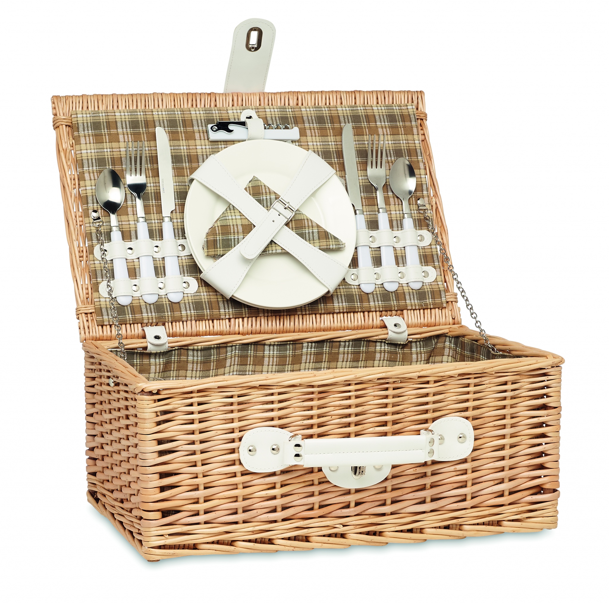 2 hengen piknikkorisetti, sisältää pullonajaavan, 2 ruostumattomasta teräksesta valmistettua lusikkaa, haarukoita ja veitsiä. 2 keraamista levyä, 2 lasia ja 2 polyesteri puuvilla lautasliinaa.