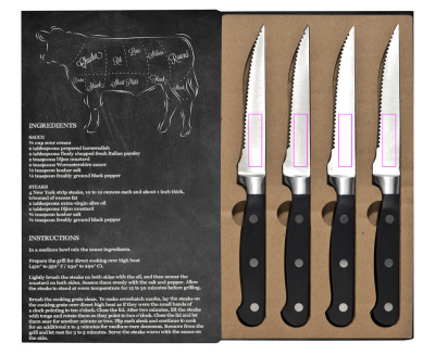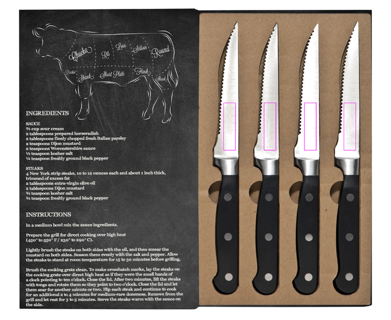 Tarina lihasta! Täydelliseen pihviin tarvitset täydelliset veitset, muuten pihvisi näyttää enemmän tai vähemmän jauhetulta. Tämä pihviveitsisarja on valmistettu ruostumattomasta teräksestä ja laatu on aivan mahtava. Pakkaus tekee setistä entistä paremman. Painamme logosi pakkaukseen.