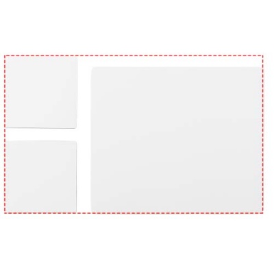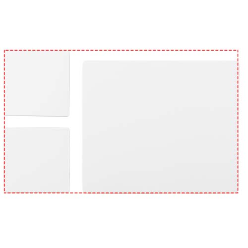 Mukana Q-Mat-hiirimatto hiiri ja kaksi vastaavaa lasinalusta, joissa on yrityksesi painatus. Settiin kuuluu suorakulmainen hiirimatto (0,3 x 23,5 x 20 cm) ja kaksi neliönmuotoista lasinalusta (0,3 x 9,8 x 9,8 cm).