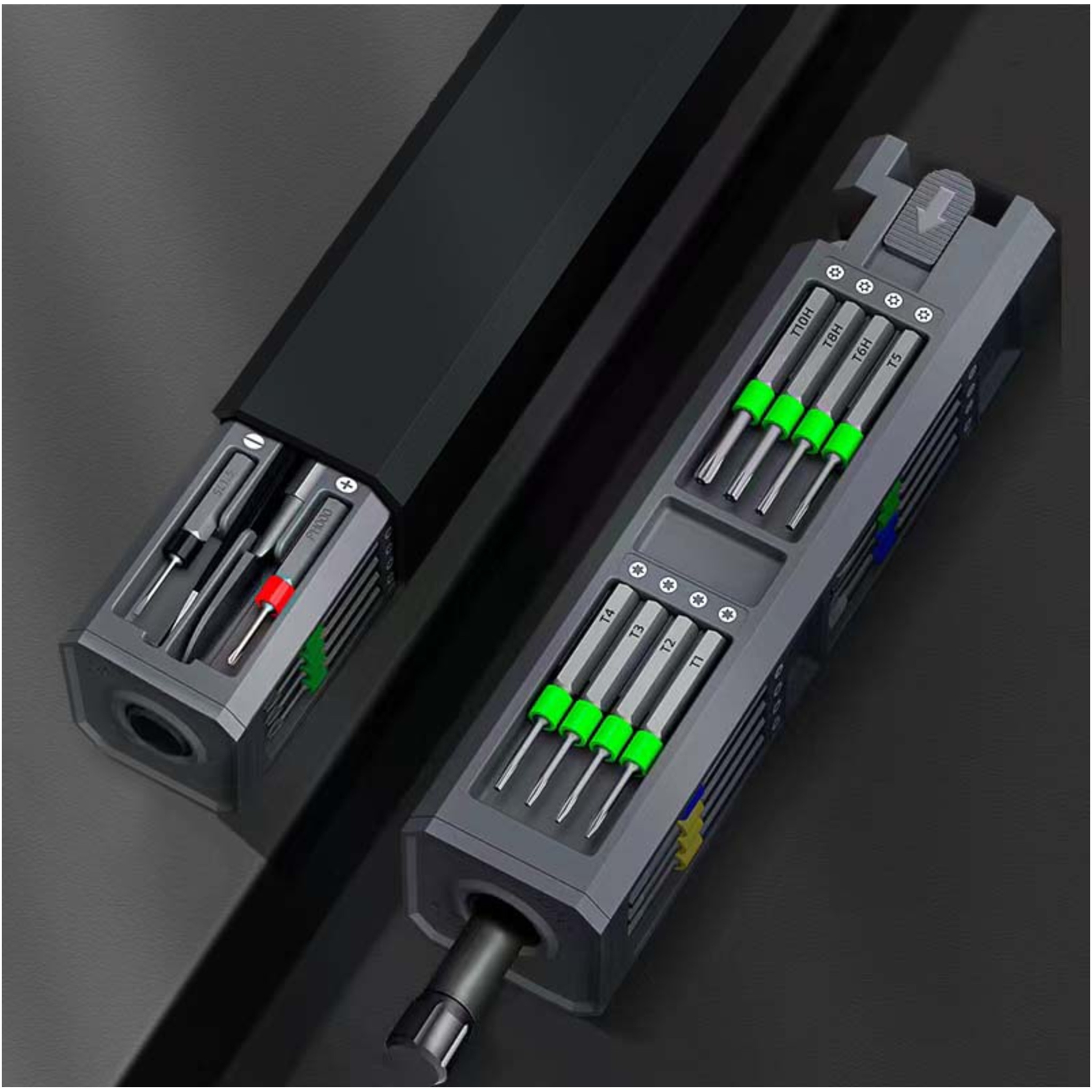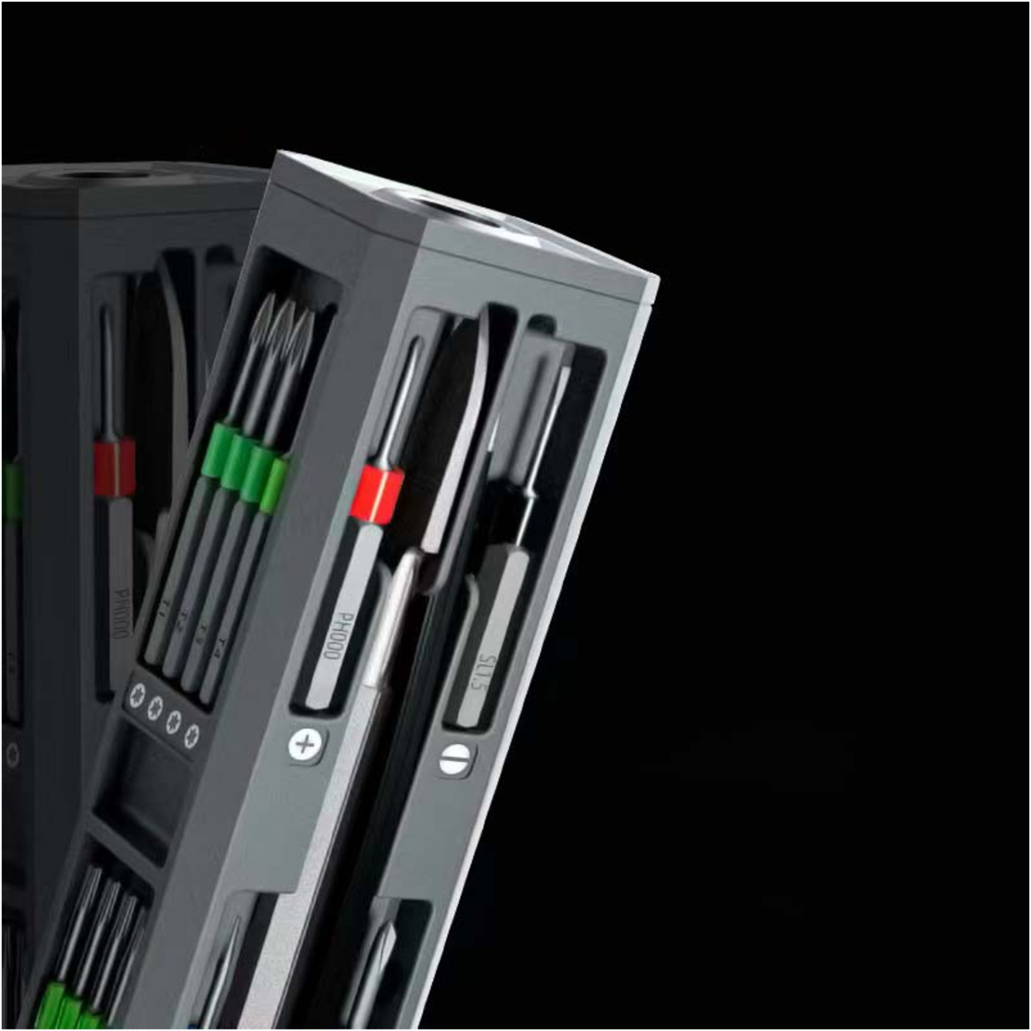 30-osainen tarkkuusruuvimeisselisetti, jossa on 28 kärkityyppiä ja kaksi lisävarustetta. Hapetettuun alumiinikoteloon (15 x 3,6 x 3,6 cm) voidaan lisätä yksilöllinen kaiverrettu logo. Kompaktin kotelon ansiosta kaikki on helppo pitää yhdessä paikassa. Manuaalinen ruuvimeisseli on täydellinen pienten laitteiden korjaamiseen, ja sen muodon ansiosta sitä on helppo käyttää ja käsitellä. Siinä on laaja valikoima kärkiä, minkä ansiosta se sopii monenlaisiin TI-harrastuksiin. Jokainen kärkityyppi on merkitty eri värillä tunnistamisen helpottamiseksi. Kärjet tarttuvat ruuvimeisseliin magneettisesti. Pakkauksessa on myös pinsetit pienten esineiden poimimiseen ja sorkkarauta, jolla voidaan nostaa ja avata koteloita. Pakattu lahjapakettiin (17 x 55 x 43,5 cm), jossa on magneettinen suljin. Sisältää kolmen vuoden takuun.