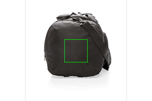 Kevyt 1680D- ja 600D-polyesterilaukku, 2-in-1. Toimii sekä reppuna että kassina. Tilava päälokero, jossa U-muotoinen, vetoketjukiinnitteinen yläosa, sivulla lokero kengille tai likavaatteille sekä vetoketjullinen tasku. Takana pullotelinetasku ja nopeapääsyinen pikkutasku. Edessä vetoketjutasku, jossa 2 RFID-suojusta. Säädettävät olkahihnat mukavaan kantamiseen eri tavoilla. Ei sisällä PVC:tä.