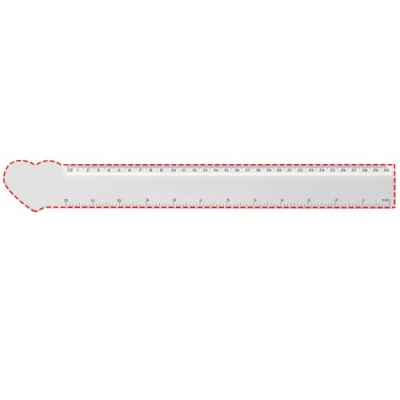 Sydämenmuotoinen kiinteä kierrätysmuoviviivain, jossa merkinnät tuumina tai senttimetreinä.