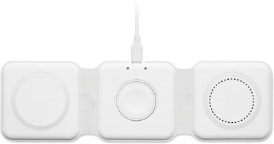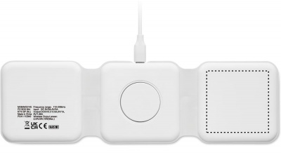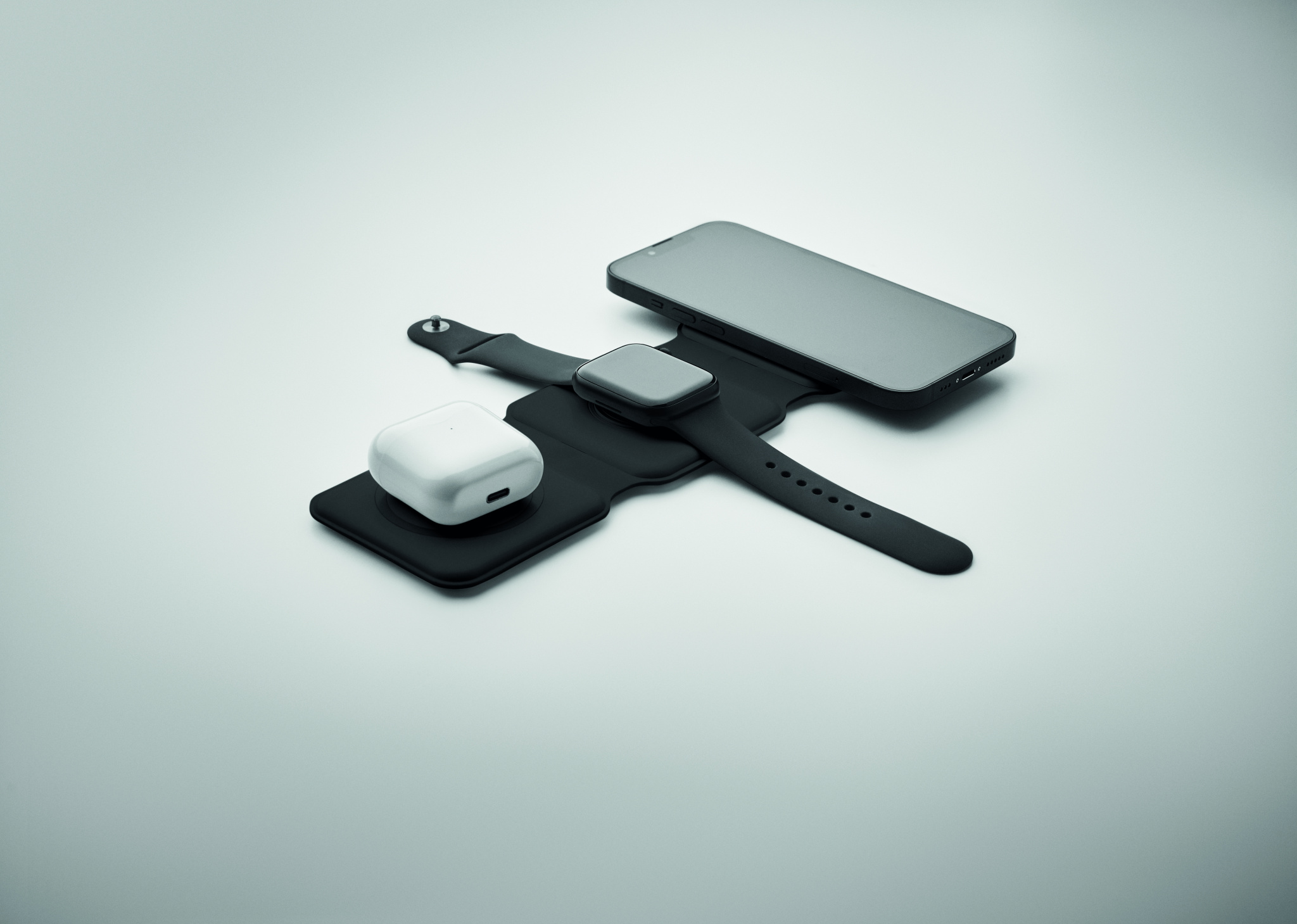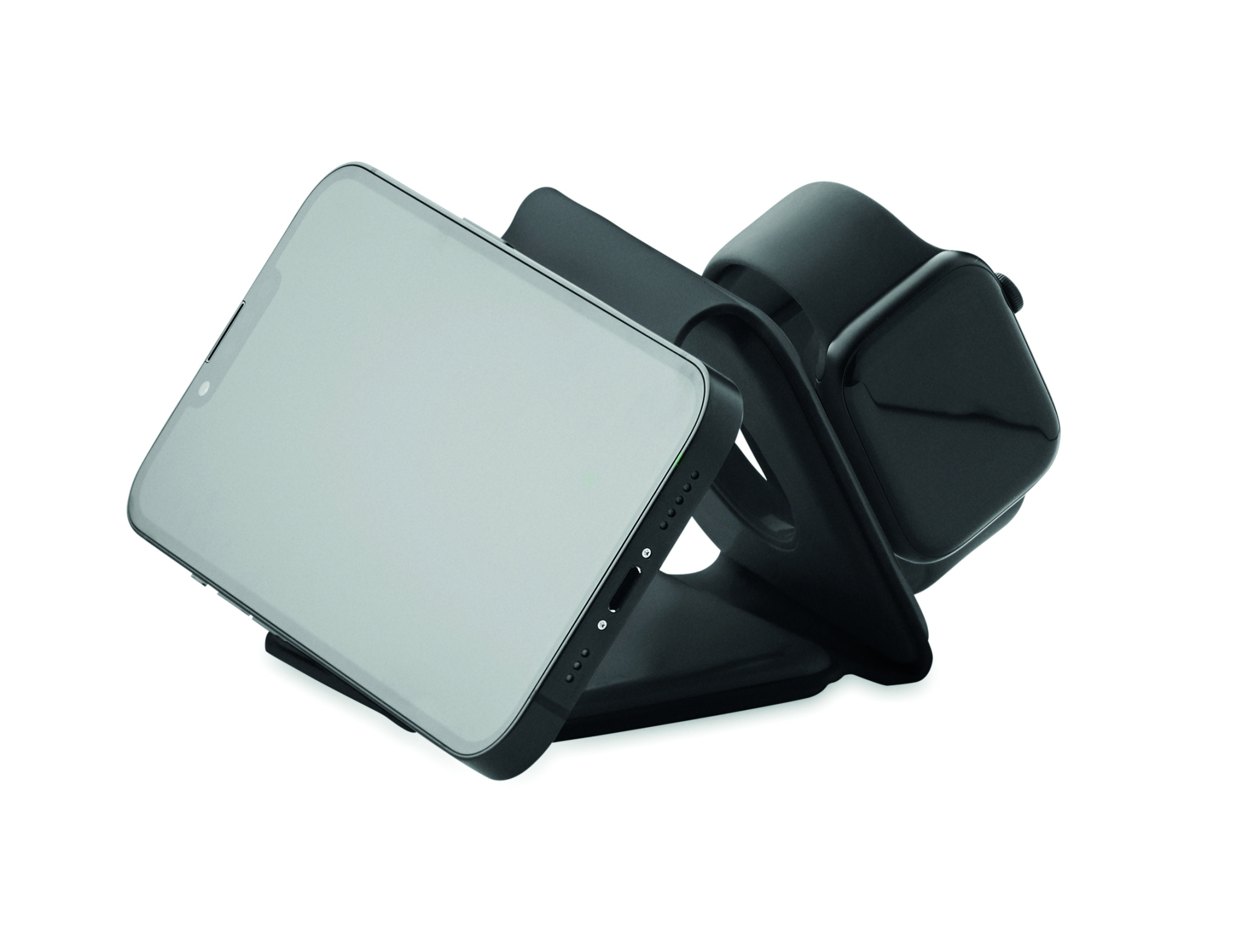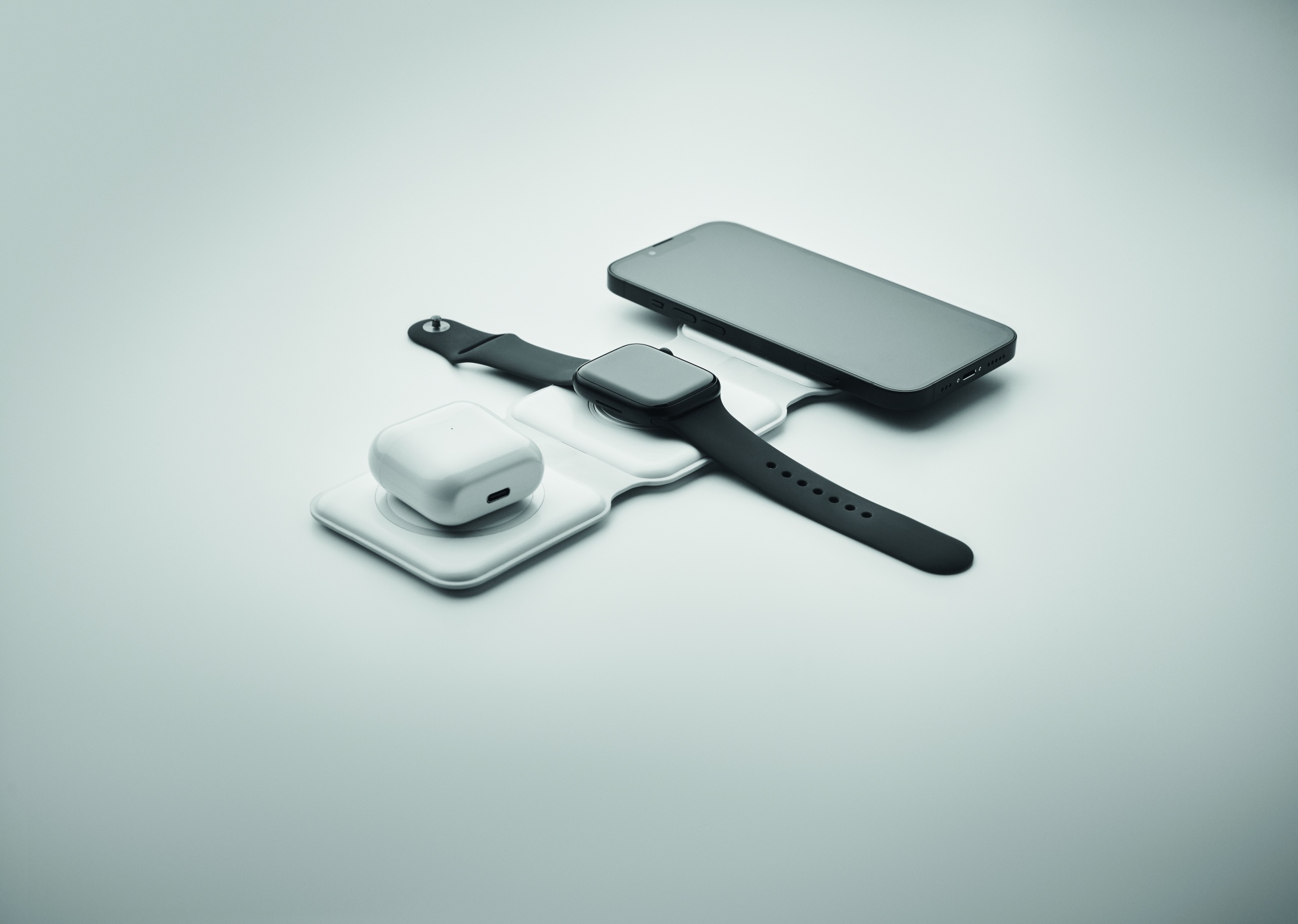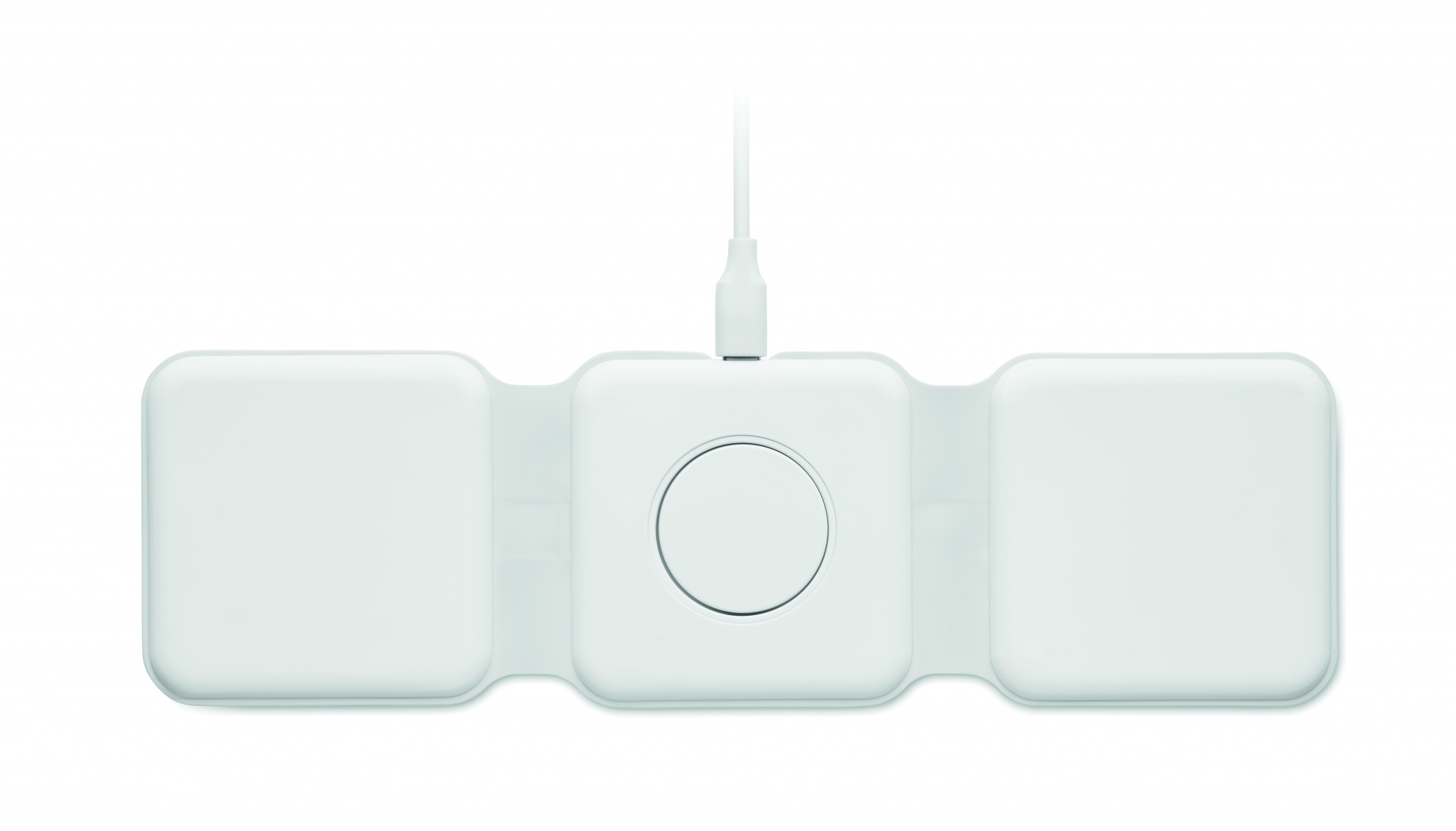 3 in 1 kokoontaitettava latausasema ABS-materiaalista. 3 langatonta latauspaikkaa. Tulo: 2-in-1 Type-C ja Type-A. Yhteensopiva QI-toiminnolla varustettujen laitteiden kanssa ( Androidien, iPhone® 8, X sekä iWatchin kanssa)