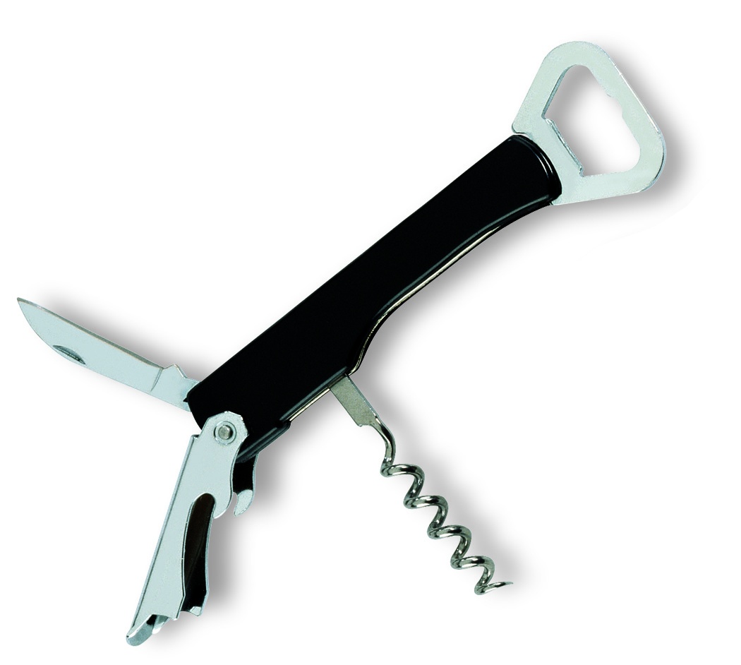 Tarjoilijan veitsi ruostumattomasta teräksestä, korkkiruuvi ja muovinen päällynen.