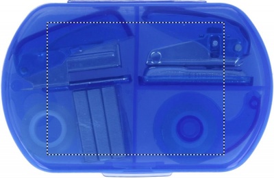 Toimistotarvike setti, sisältää teippiannostelijan, mininitojan, mini-rei´ittäjän, 300 niittiä ja teippirullan. Pakattuna läpikuultavaan muovilaatikoon.