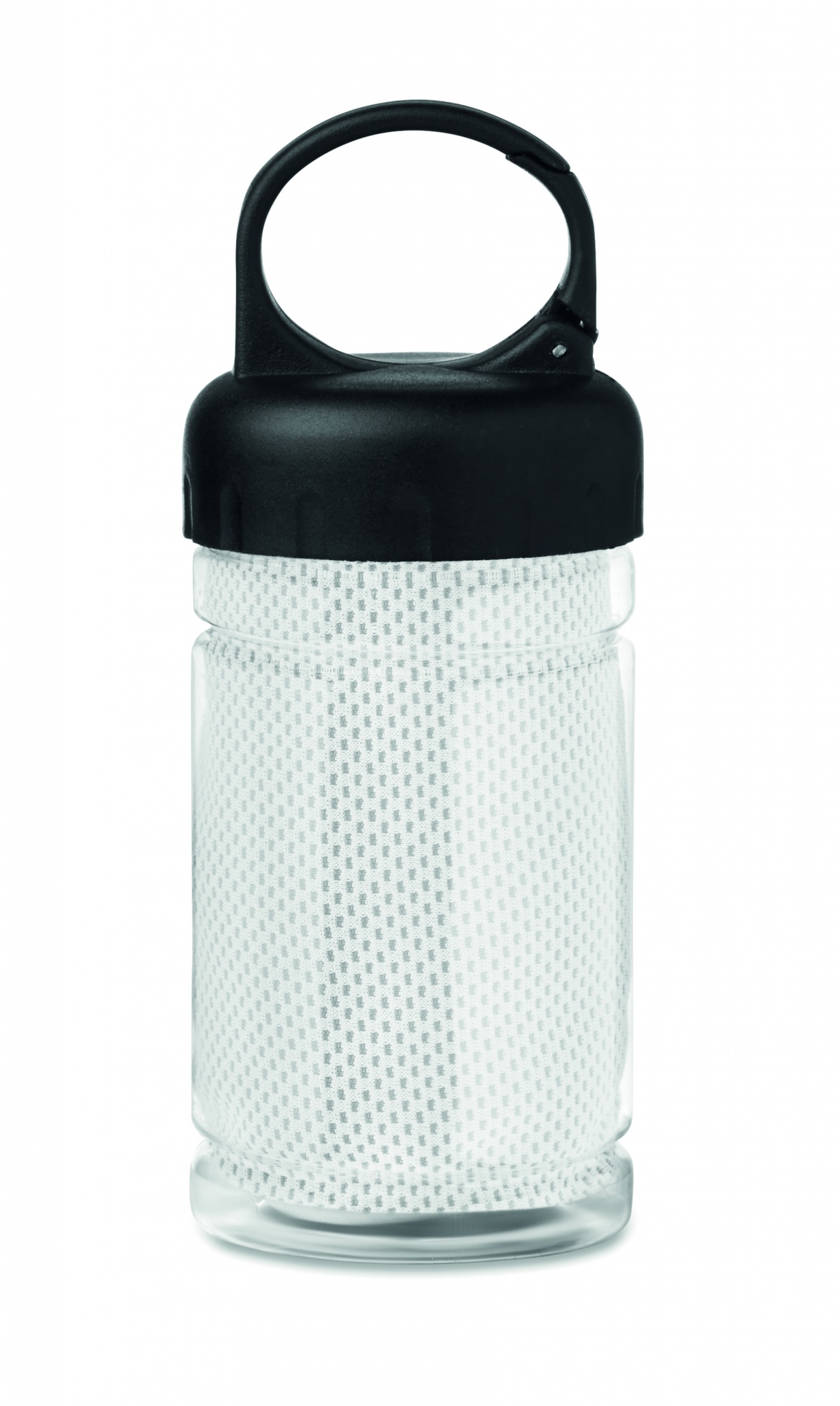 Urheilupyyhe 300 ml PET pullossa, pyyhe on valmistettu 100% polyesterikuidusta.