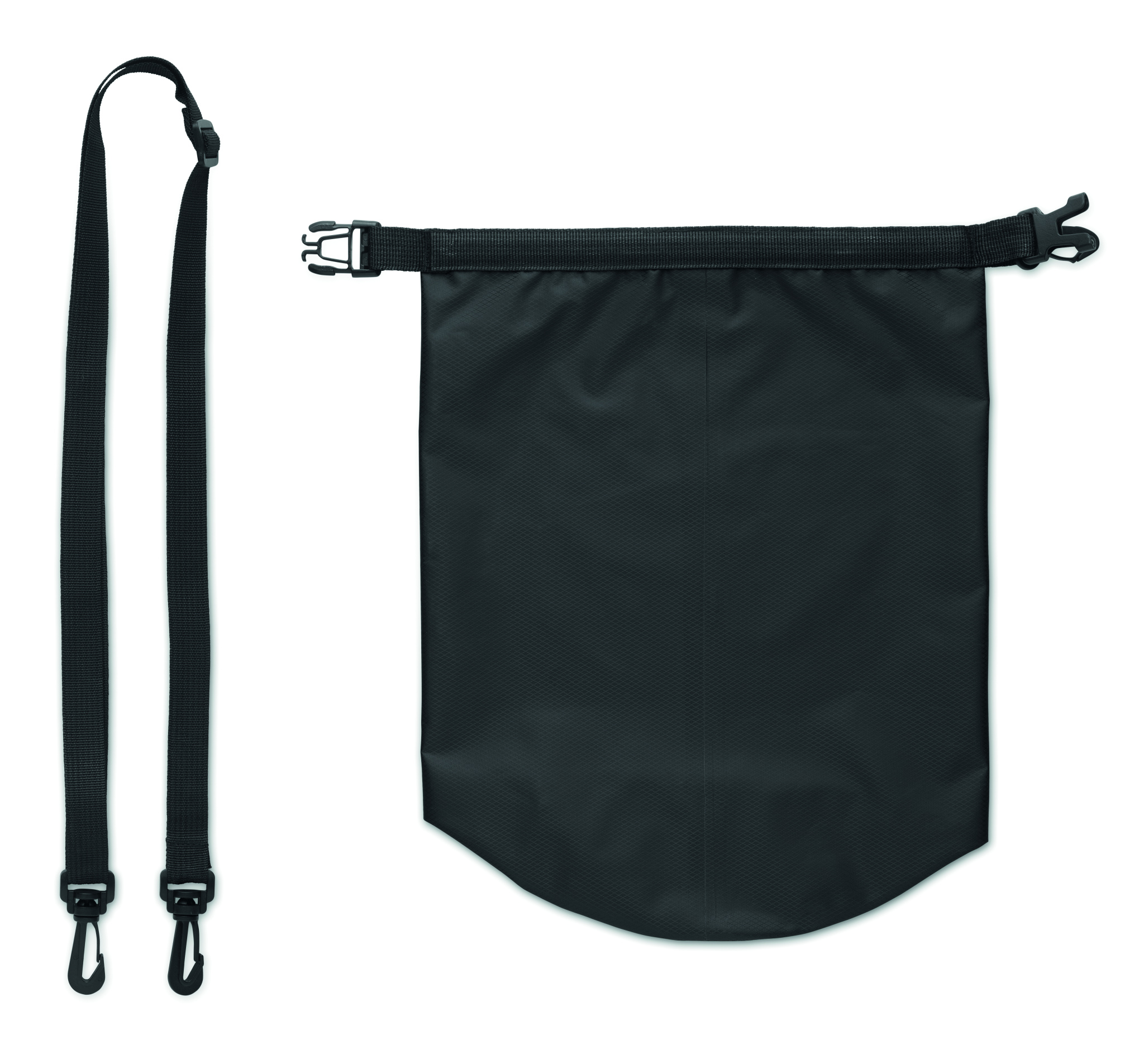 Vedenpitävä (IPX6) laukku 210T RPET ripstop -materiaalia olkahihnalla. Tilavuus 5L.