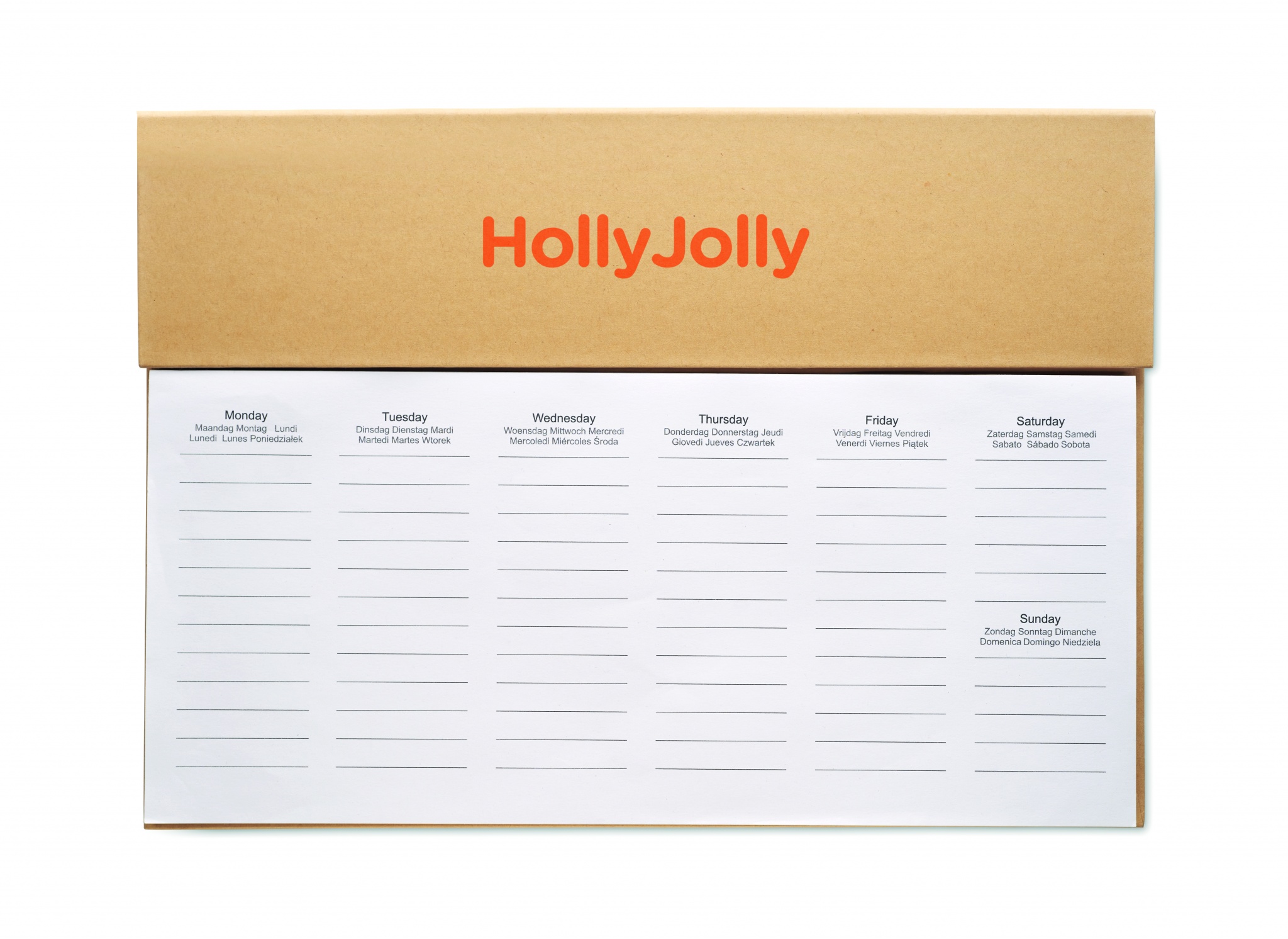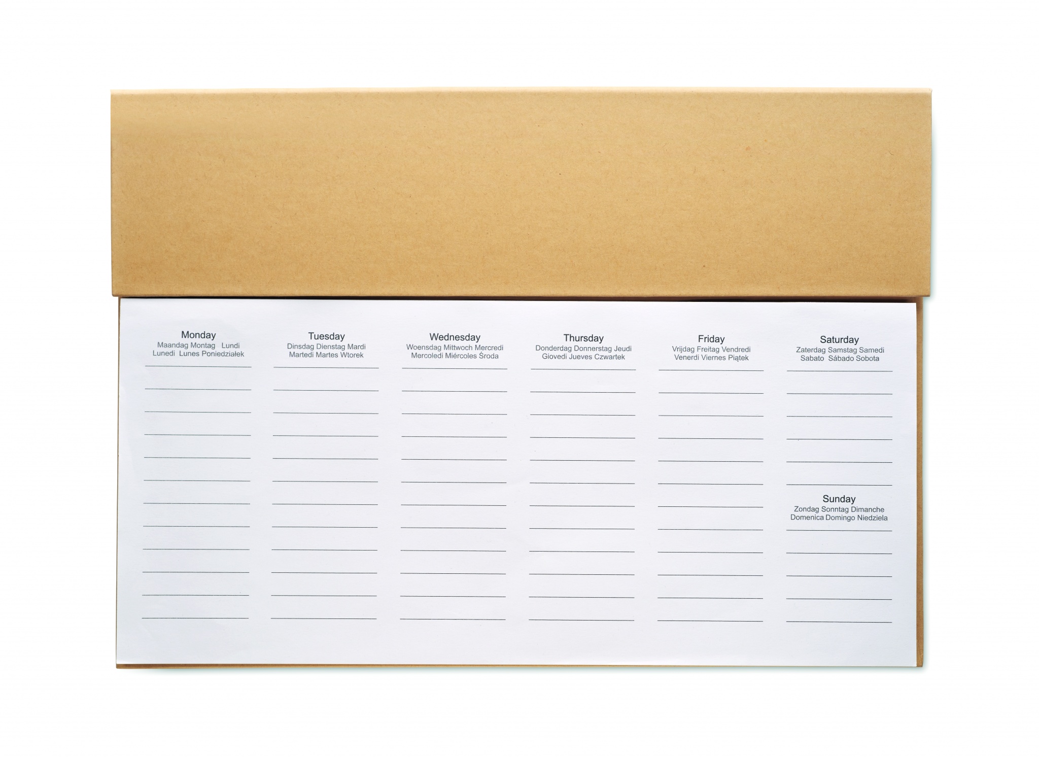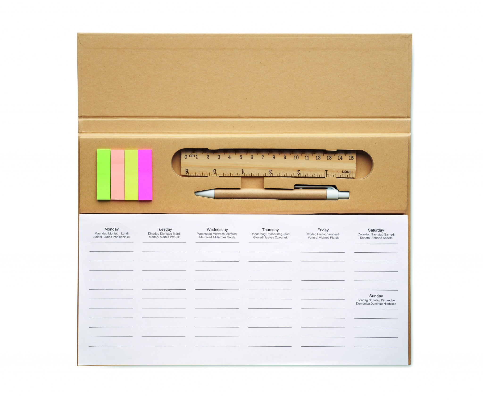 125-sivuinen viikoittainen pöytäkalenteri kuudella kielellä (EN/DE/FR/ES/IT/NL/PL), jossa on voimapaperikansi, kartonkiputki, sinisellä musteella kirjoittava painonappikynä, puinen viivoitin ja muistilappu.