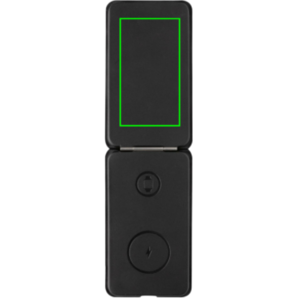 Prabangus ir sulankstomas „trys viename“ belaidis įkroviklis, pagamintas iš RCS sertifikuoto perdirbto PU. Bendras perdirbtas turinys: 5% nuo bendro prekės svorio. RCS sertifikatas užtikrina visiškai sertifikuotą perdirbtų medžiagų tiekimo grandinę. Belaidžio įkroviklio priekyje yra magnetinis 15 W belaidis įkroviklis. Kitoje pusėje yra papildomas 5 W belaidis įkroviklis, tinkamas ausinių dėklams ar kitiems mažiems belaidžiams įkraunamiems įrenginiams, ir 2,5 W belaidis įkroviklis išmaniesiems laikrodžiams (tik Apple laikrodžiams) Su RCS sertifikuotu 120 cm perdirbtu TPE laidu. Supakuota į FSC® mix kraft pakuotę. Prekė ir priedai 100% be PVC. Įvestis: 9V/3A optimaliam naudojimui. Išėjimas: Priekyje: 9V/1.1A; 9V/1,67 A/(15W), ausinės: 5V/1A (5W), laikrodis: 5V/0,5A.