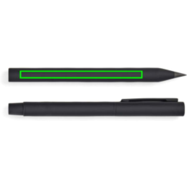 Šį modernų ir elegantišką rinkinį sudaro du rašikliai: amžinas rašiklis ir klasikinis tušinukas su dangteliu ir segtuku. Šie rašikliai, sukurti pagal stilių ir funkcionalumą, yra pagaminti iš RCS sertifikuoto perdirbto nerūdijančio plieno, padengti guminiu paviršiumi, kad būtų patogu suimti, ir matinis paviršius. Abu rašikliai turi subalansuotą svorį, kuris užtikrina stabilumą ir lengvą rašymą. Amžinasis rašiklis siūlo neribotą rašymą. Tušinukas pasižymi puikiu 1,00 mm antgaliu ir užtikrina sklandų, nuoseklų rašymą dokumentiniu mėlynu rašalu, išliekančiu iki 1200 metrų. Sertifikuotas RCS (Recycled Claim Standard), RCS sertifikatas garantuoja, kad visa perdirbtų medžiagų tiekimo grandinė yra sertifikuota. Bendras perdirbto produkto kiekis priklauso nuo bendro produkto svorio. Šiame gaminyje yra 52 % RCS sertifikuoto perdirbto aliuminio ir 10 % RCS sertifikuoto nerūdijančio plieno.