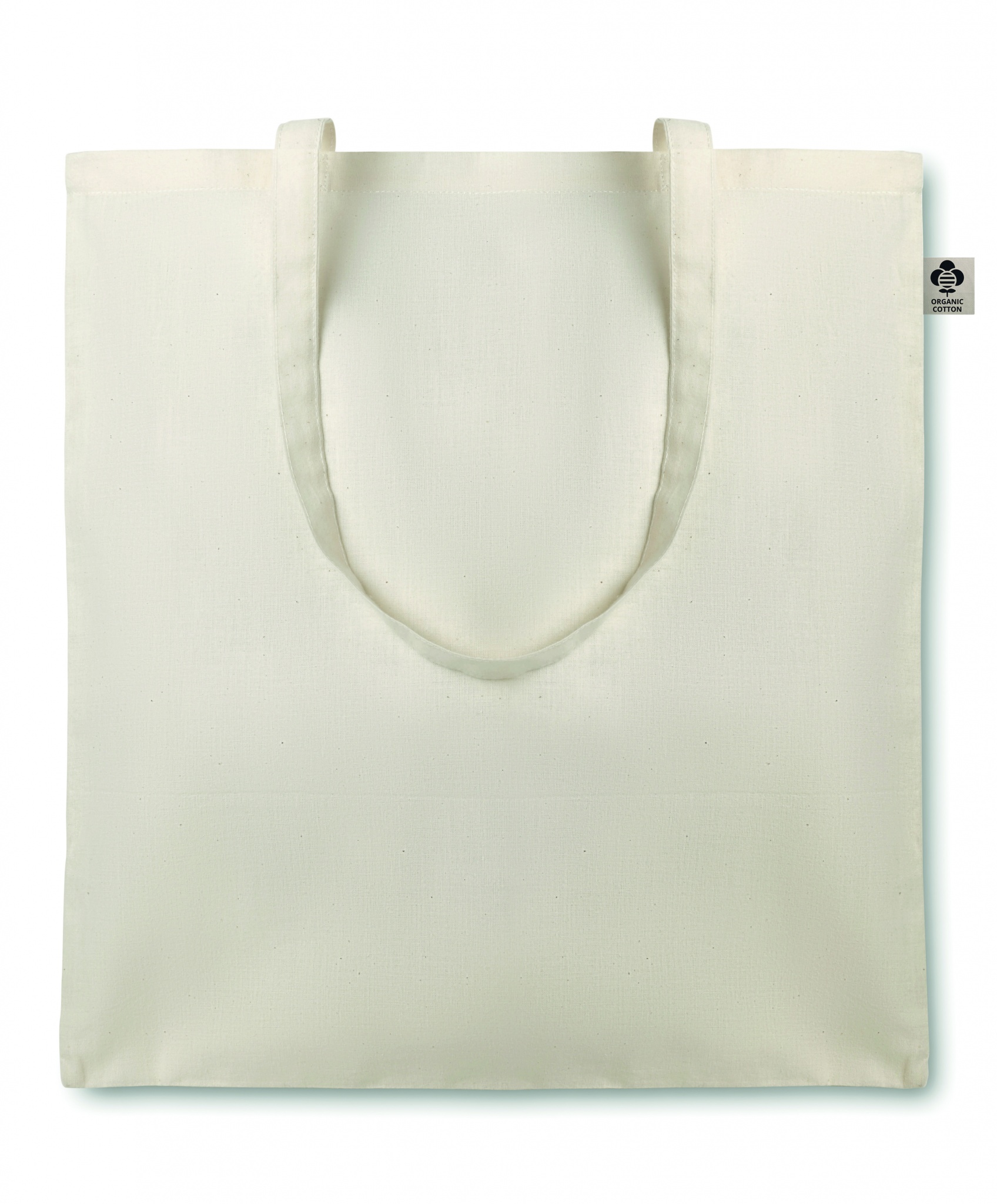Organiskās kokvilnas iepirkumu maisiņš ar gariem rokturiem. 105 gr/m².