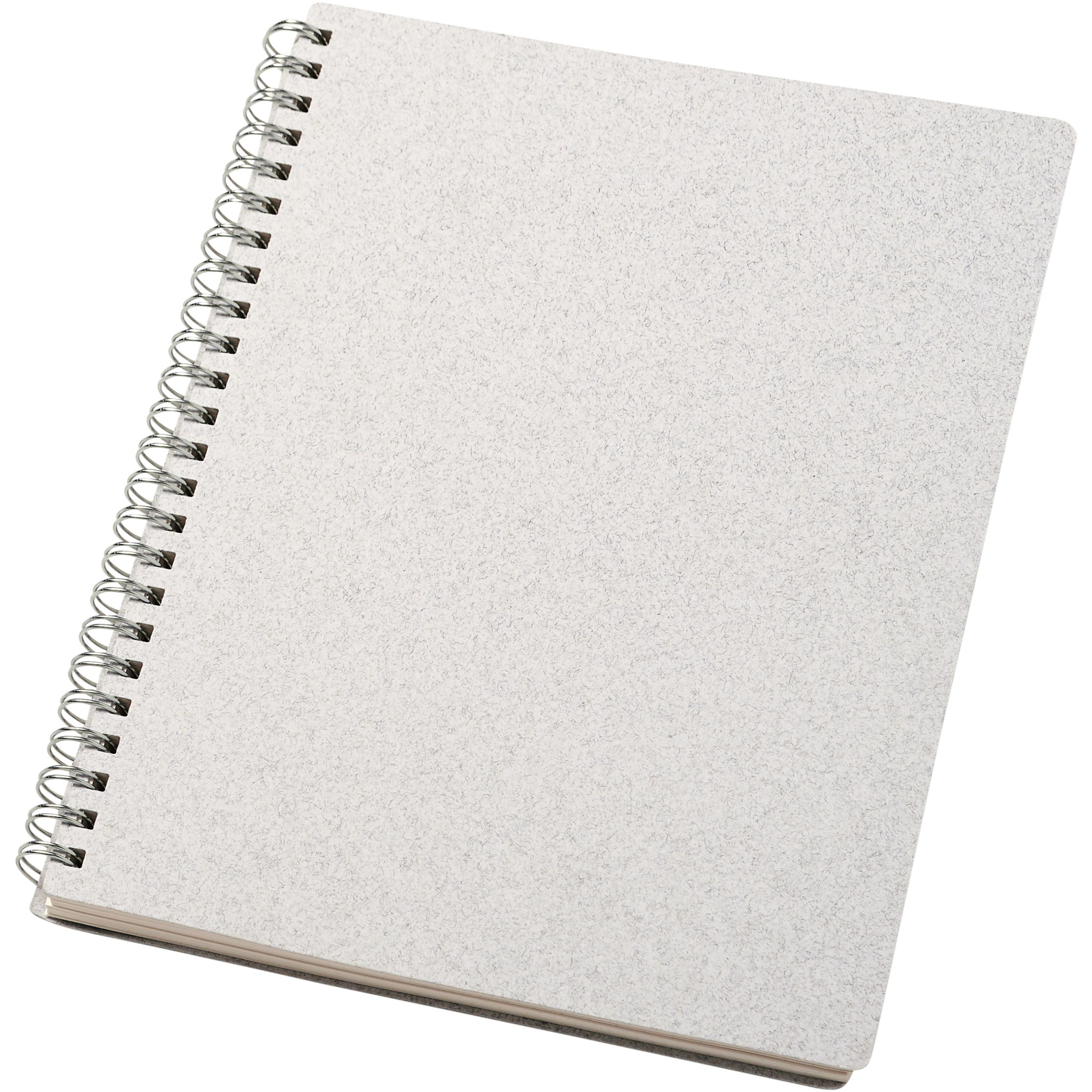 A5 izmēra piezīmju grāmatiņa, kas izgatavota no atbildīgi iegūtiem vāka materiāliem, kas satur kokvilnas atkritumus (15%) un pēcpatēriņa pārstrādātus atkritumus (40%). Ietver 80 loksnes, 80 g/m2 100% atbildīgi iegūts pārstrādāts papīrs ar punktētu režģi. Punktētais izkārtojums apvieno līniju, vienkāršu un kvadrātveida lapu priekšrocības, vienlaikus nodrošinot struktūru un rosinot radošumu, padarot šo piezīmjdatoru piemērotu plašam lietotāju lokam. Pateicoties spirālei, piezīmjdatoru ērtībai var novietot plakaniski, un to var viegli salocīt. Ražots Itālijā.