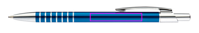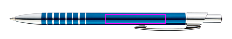 Plāna metāla lodīšu pildspalva ar zilu uzrakstu un iegravētu satvēriena zonu. Mēs iegravējam jūsu logotipu zem klipa.