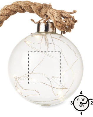 Stikla bumbiņa (Ø 8 cm) ar 8 LED silti dzeltenām lampiņām un džutas auklu. 2 AA baterijas neietilpst.