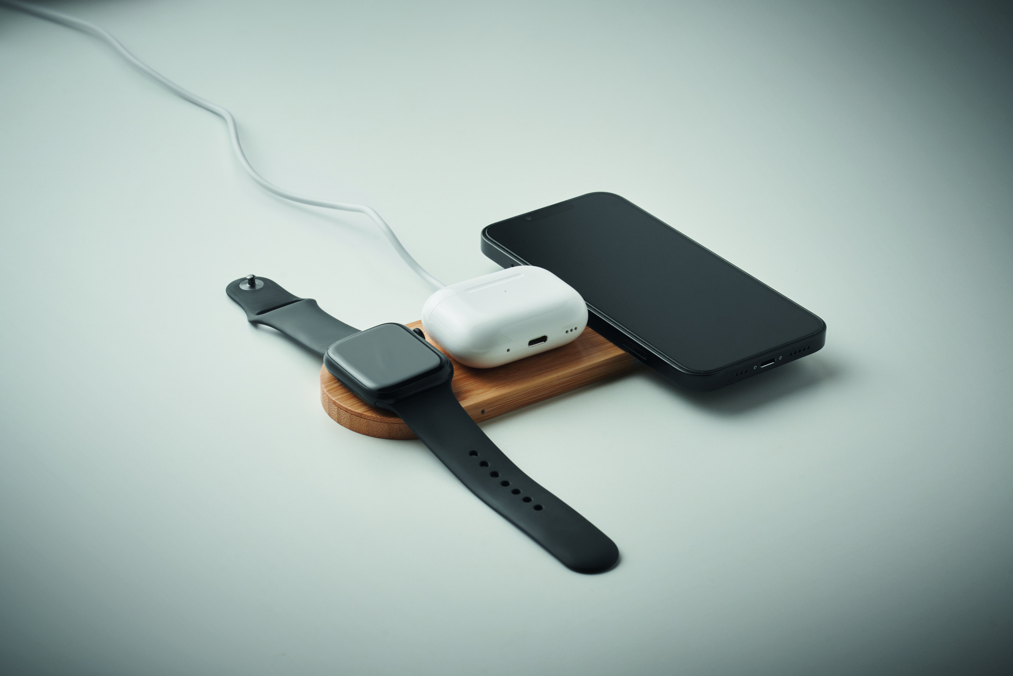 3 in 1 charging station in bamboo case. It includes a wireless charger 15W, smartwatch charger (Apple® only) and TWS charger.