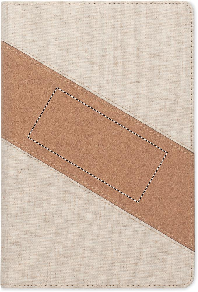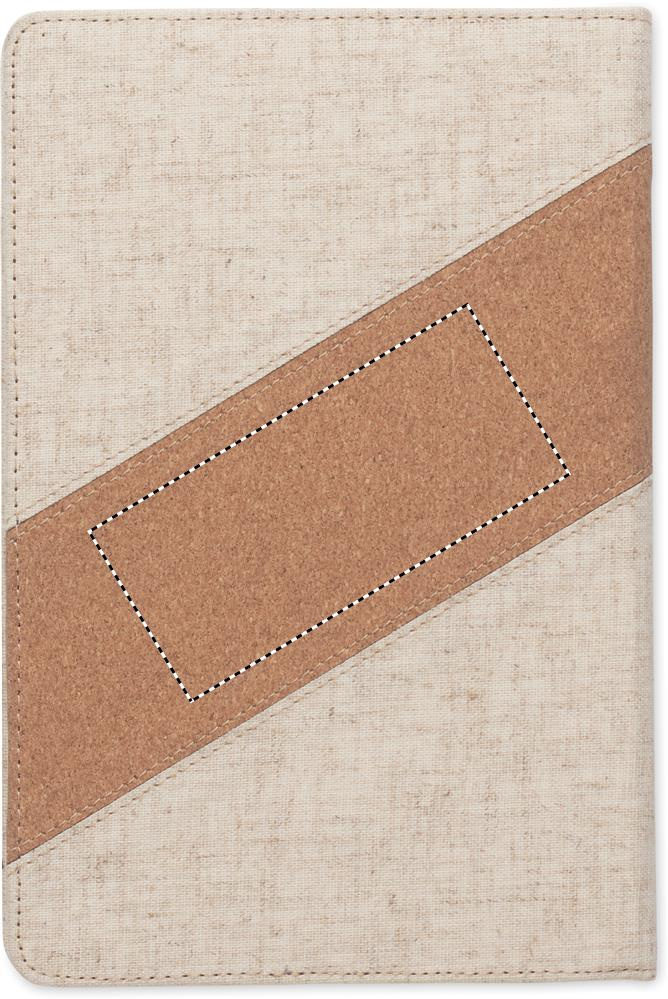 2 in 1 notebook. A5 notebook with integrated wireless charger 15W. Features cotton and cork details on cover, 128 lined paper (64 sheets). Ribbon bookmark.