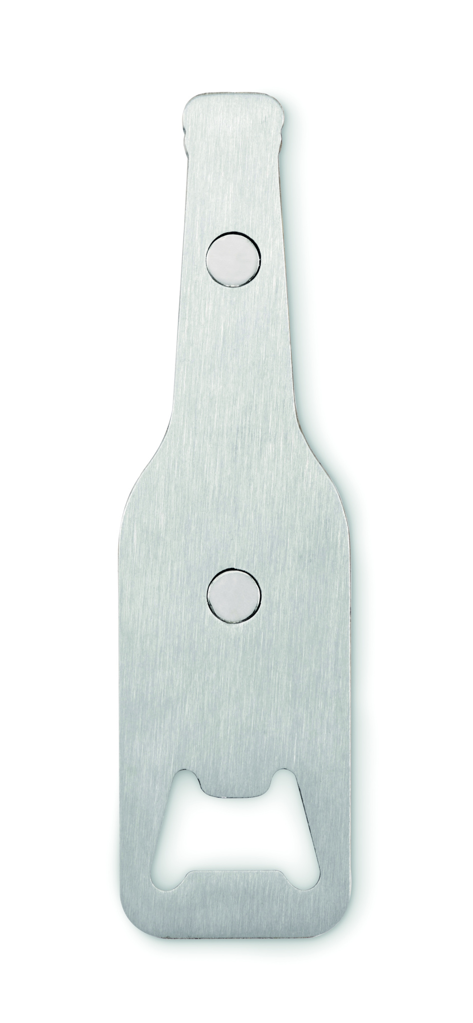 Magnetic bottle opener in stainless steel with bamboo surface.