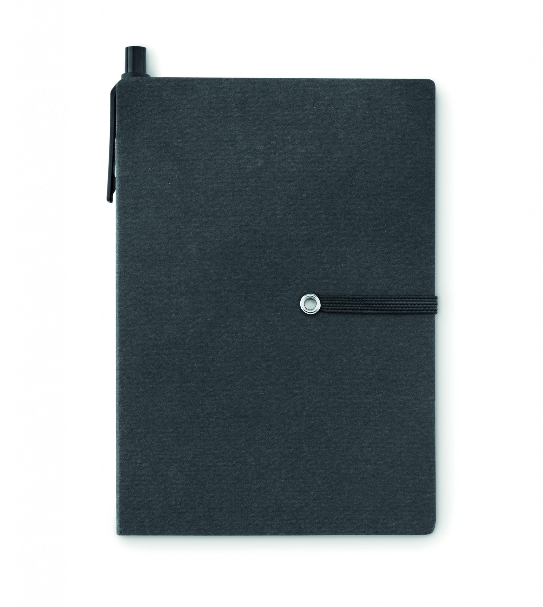 Блокнот на 80 линованных страниц с ручкой и стикерами. Закрывается резинкой. Изготовлен из биопереработанного картона. В ручке- черные чернила.