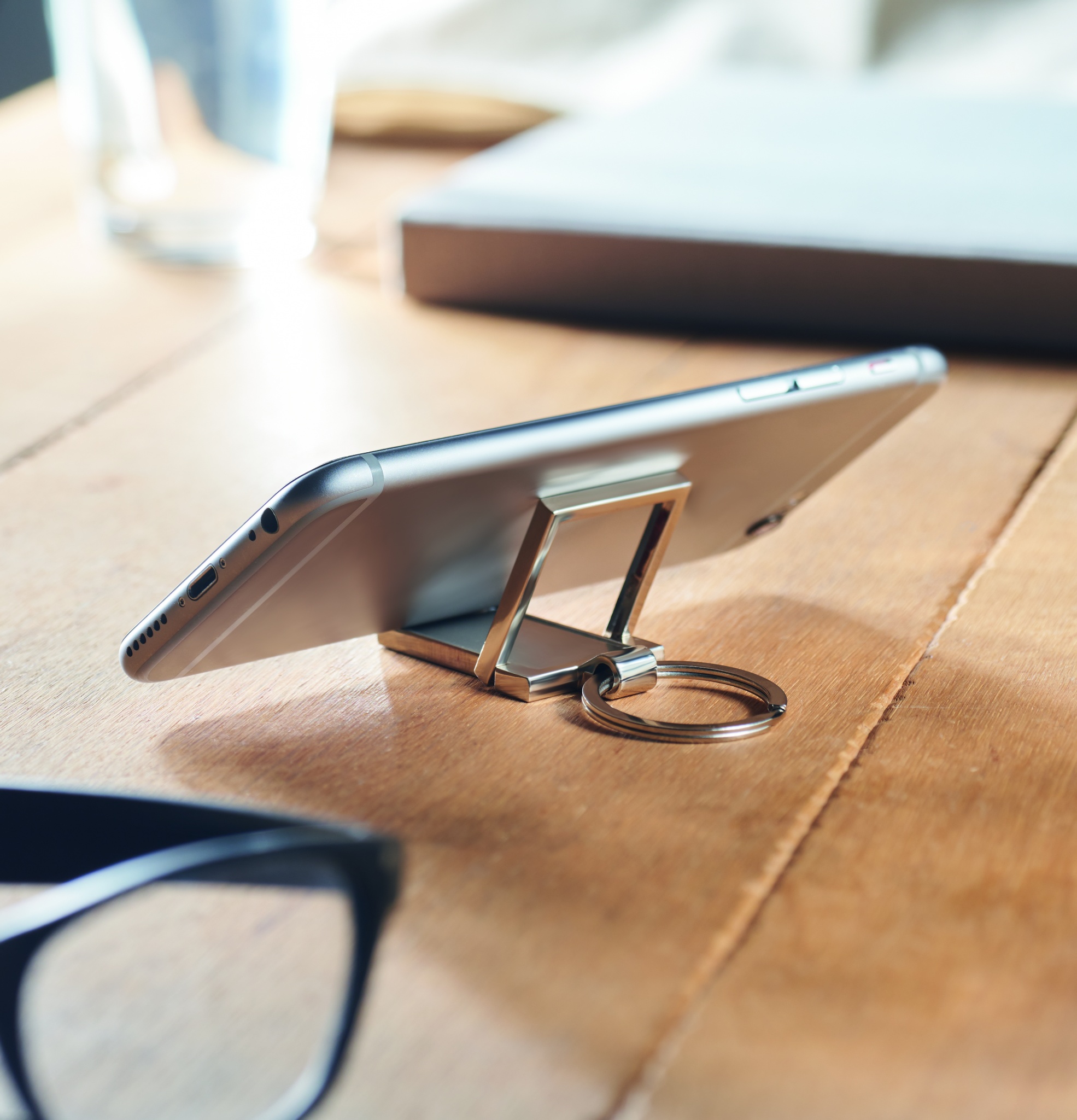 Металлический брелок для ключей с подставкой для телефона.