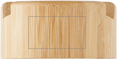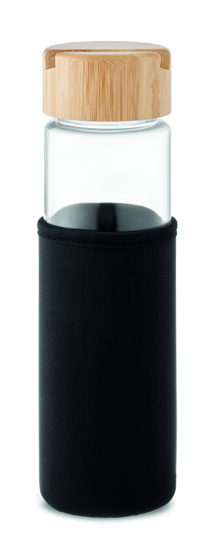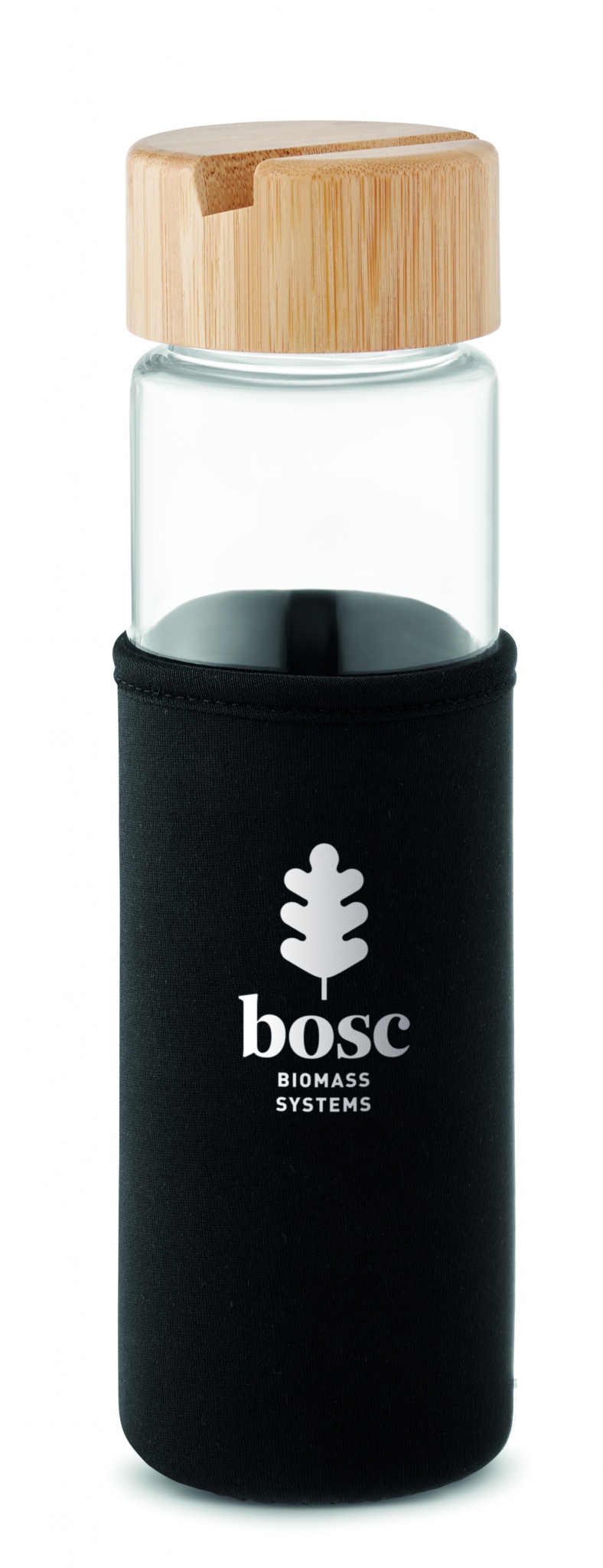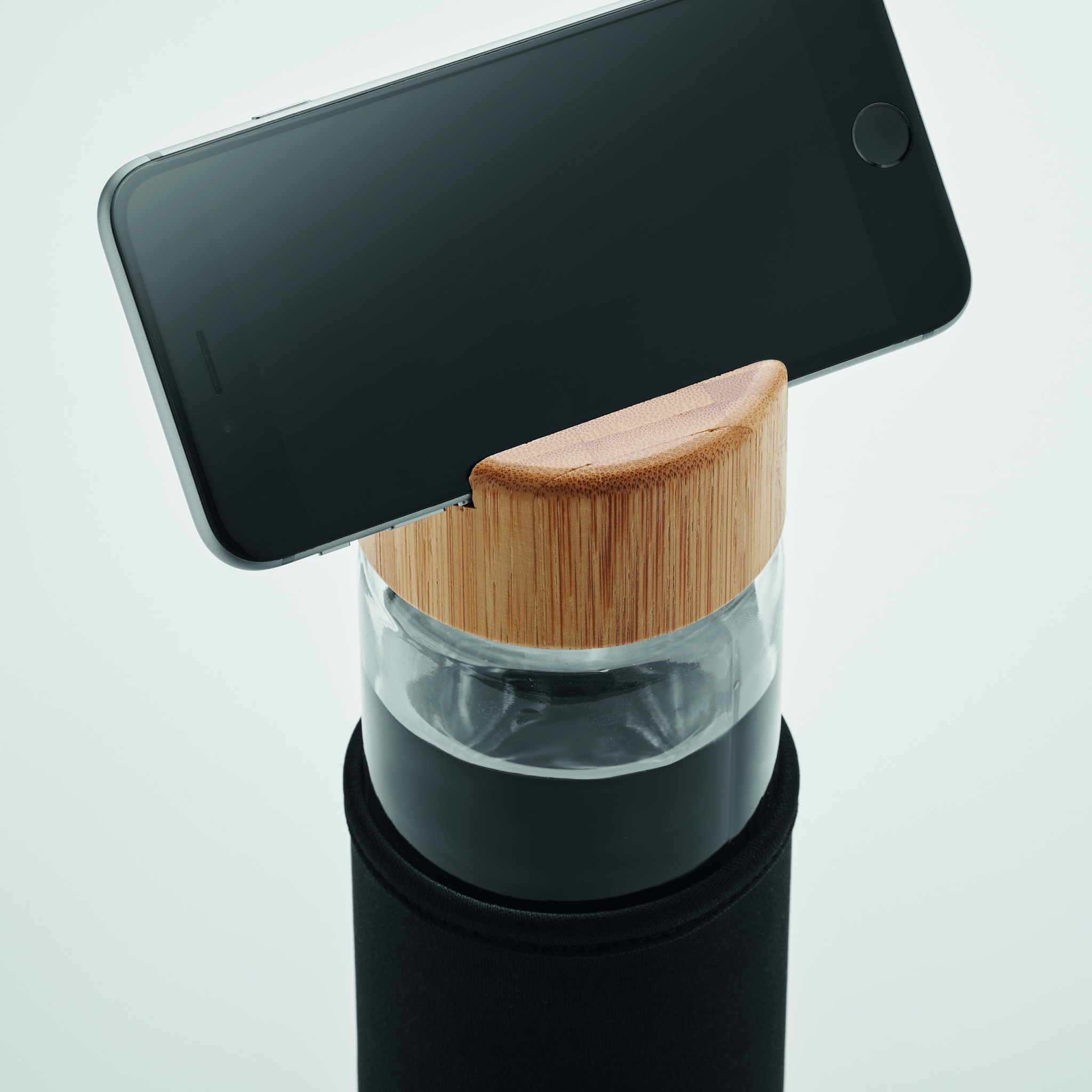 Стеклянная бутылка в неопреновом чехле с бамбуковой крышкой, которая также является подставкой для смартфона. Герметична. Емкость: 600 мл.