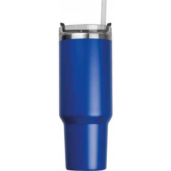 Двустенная кружка XXL (емкость около 1,2 литра) из нержавеющей стали с вакуумной изоляцией, включая соломинку, крышку и ручку из пластика без BPA. Ее узкая нижняя часть подходит для всех стандартных подстаканников.