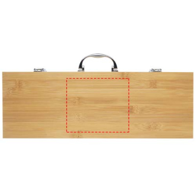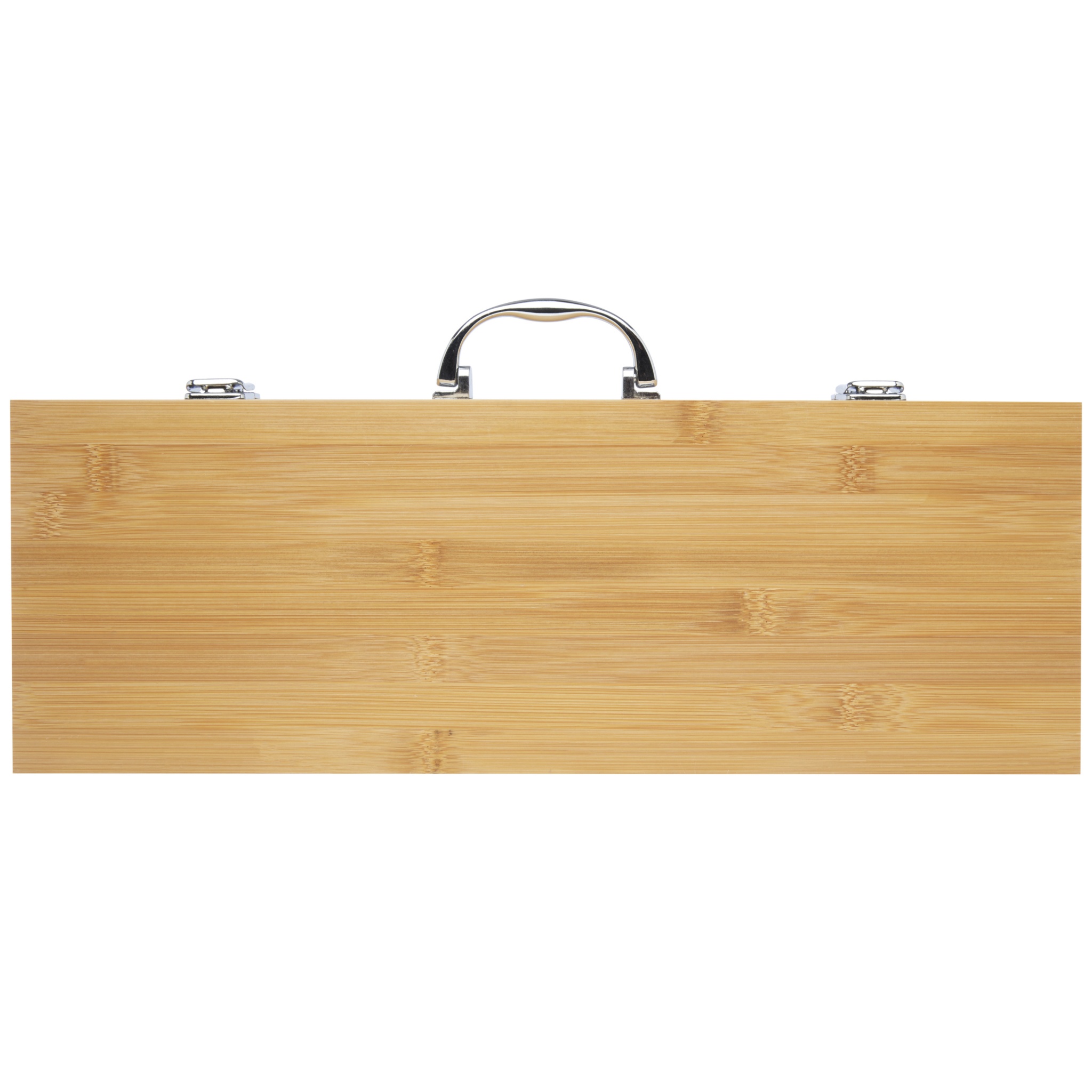 Набор для барбекю из 5 предметов из бамбука: лопатка (40 x 9,5 см), щипцы (34,5 x 6 см), вилка (38,5 x 3 см), нож (38,5 x 3 см) и щетка (38 x 4,3 см). Набор поставляется в подарочной коробке из бамбука (46 x 16,2 x 7,4 см). Ручки и подарочная коробка изготовлены из бамбука, который производится в соответствии со стандартами устойчивого развития.