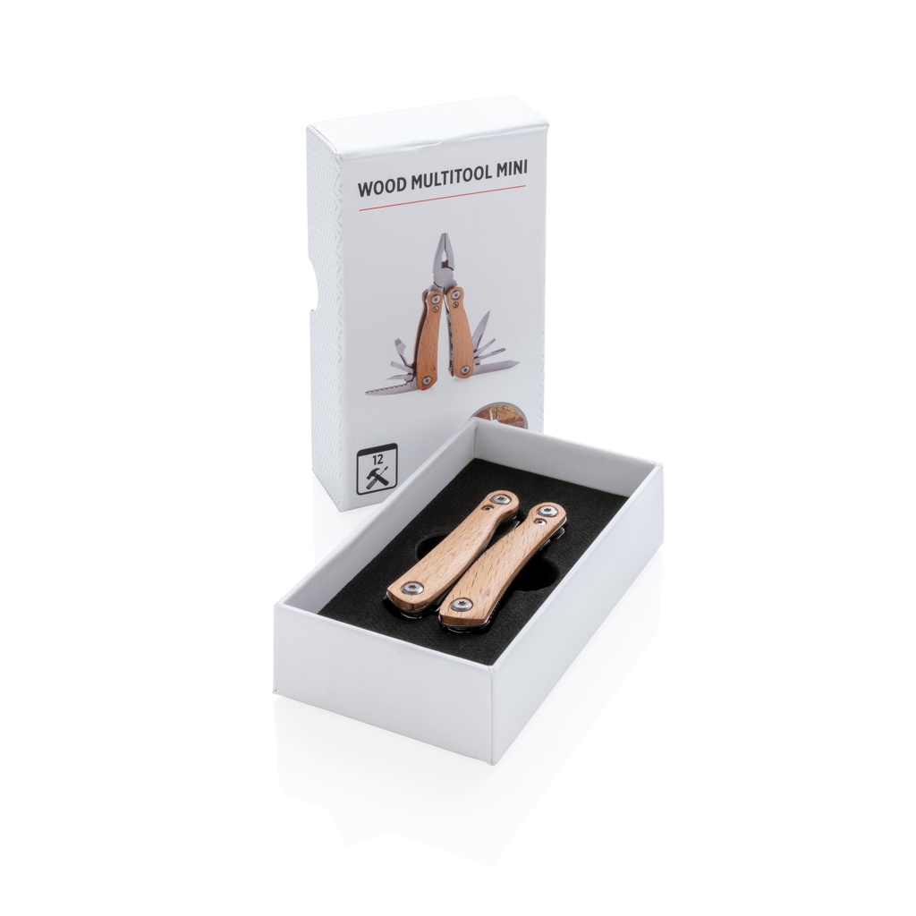 Компактный и прочный многофункциональный инструмент с 12 функциями. С корпусом из бука и высококачественными инструментами из нержавеющей стали. В набор входят: плоскогубцы с длинными носами, стандартные плоскогубцы, кусачки, зубчатое лезвие, маленький нож, средняя плоская отвертка, открывалка для бутылок, большая плоская отвертка, нож, малая плоская отвертка, крестовая отвертка, напильник и очиститель. Упакован в подарочную коробку.