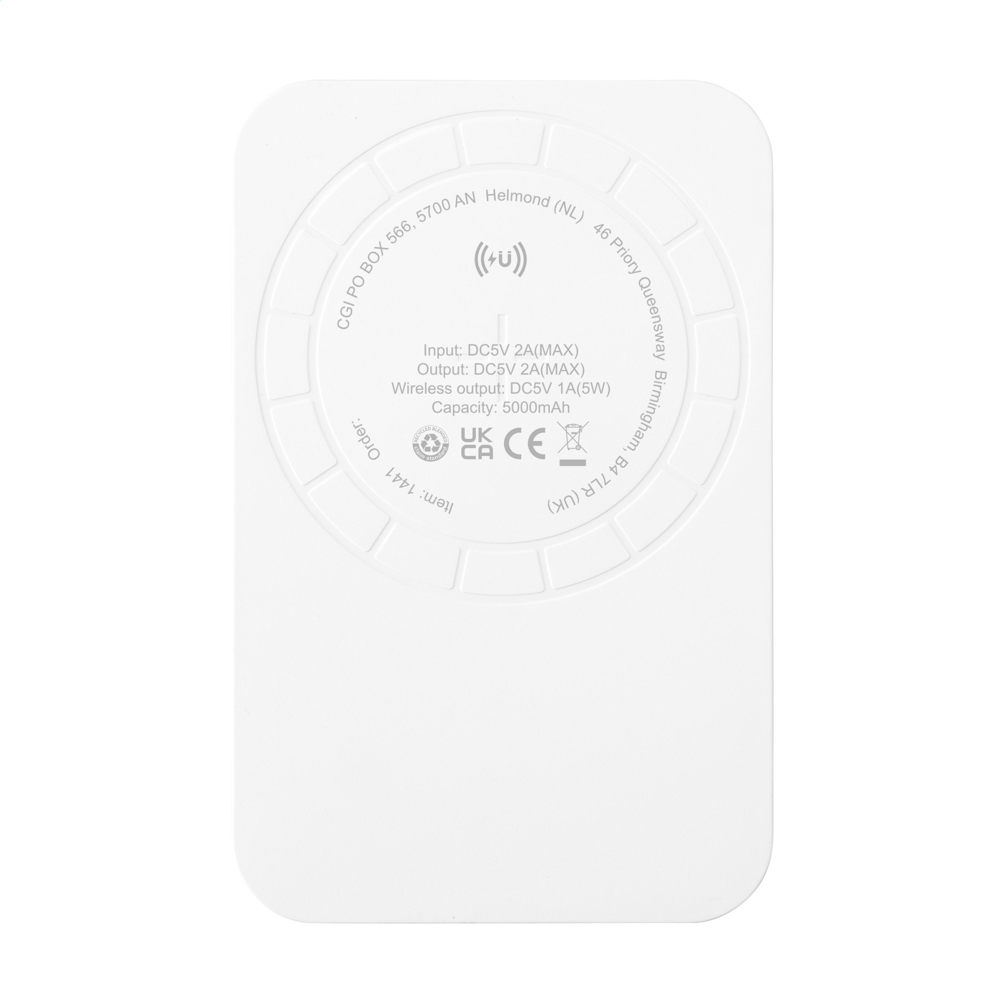 Магнитный беспроводной внешний аккумулятор из переработанного АБС-пластика со встроенным полимерным аккумулятором (5000 мАч). Просто приложите зарядное устройство к задней части мобильного телефона, чтобы зарядить устройство. Встроенные магниты (17 высококачественных термостойких N52H) в этом зарядном устройстве идеально выровнены и всегда гарантируют, что ваш телефон будет расположен правильно для оптимальной зарядки. Также в комплект входит дополнительное магнитное металлическое кольцо для поддержки зарядки немагнитных беспроводных перезаряжаемых смартфонов. Совместимо со всеми мобильными устройствами, поддерживающими беспроводную зарядку QI (последнее поколение Android и iPhone 8 и выше). Для других моделей телефонов этот продукт можно использовать как обычное беспроводное зарядное устройство. Вход и выход Type-C: 5 В/2 А. Выход USB: 5 В/2 А. Беспроводной выход 5 В/1 А 5 Вт. В комплект входит кабель для зарядки Type-C и руководство пользователя. Как продукт, так и его аксессуары не содержат ПВХ. Сертифицировано RCS. Общее количество переработанного материала: 30%. Каждый предмет упакован в индивидуальную коробку.