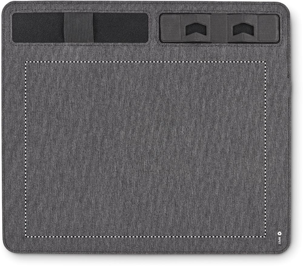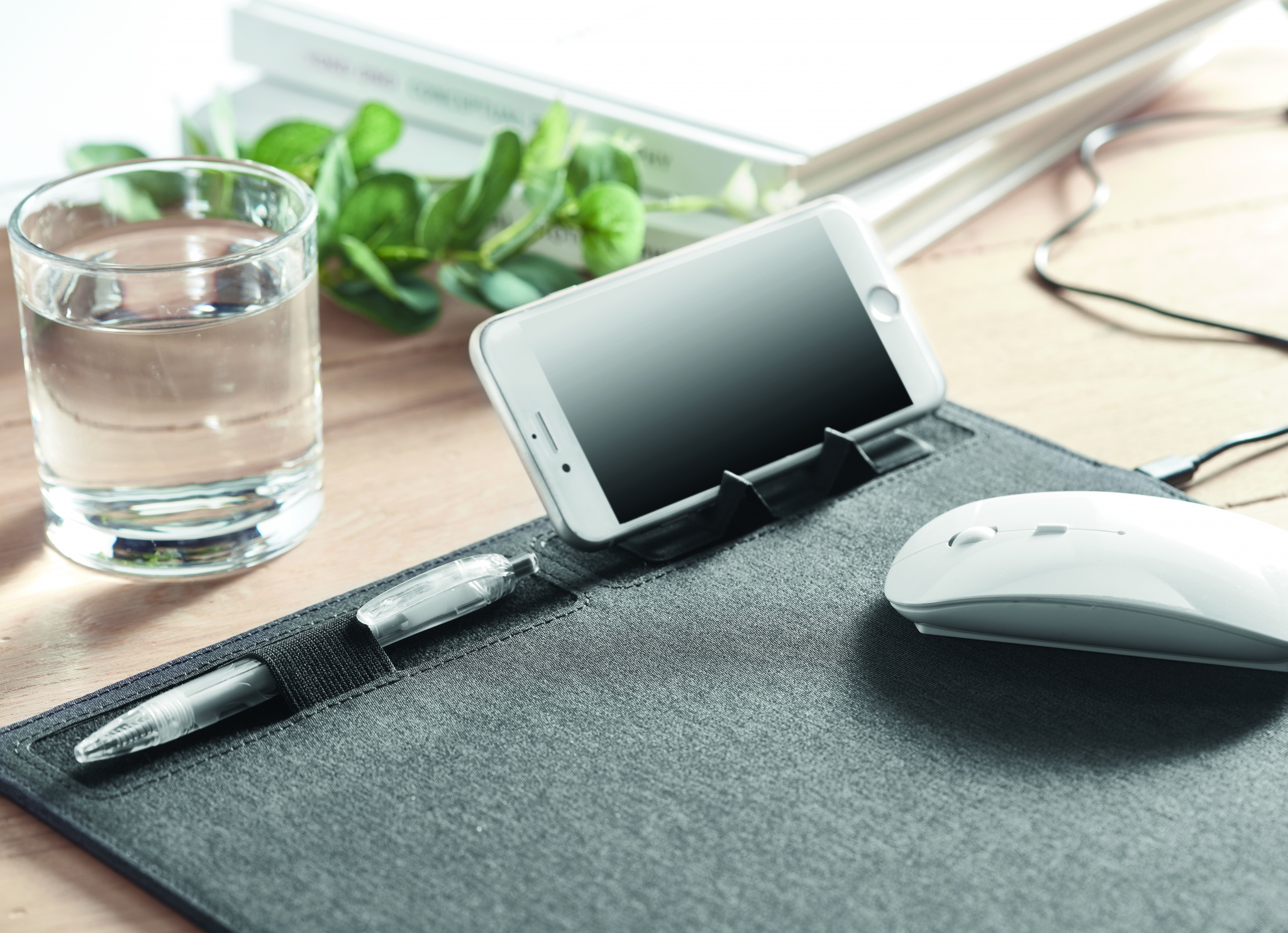 Коврик для мыши из 300D RPET с функцией б/п зарядного устройства 15Вт и подставкой для телефона. Выход: DC 9V/1.6A (15W) для быстрой зарядки. Совместим с последними Androids, iPhone® 8 и новее.