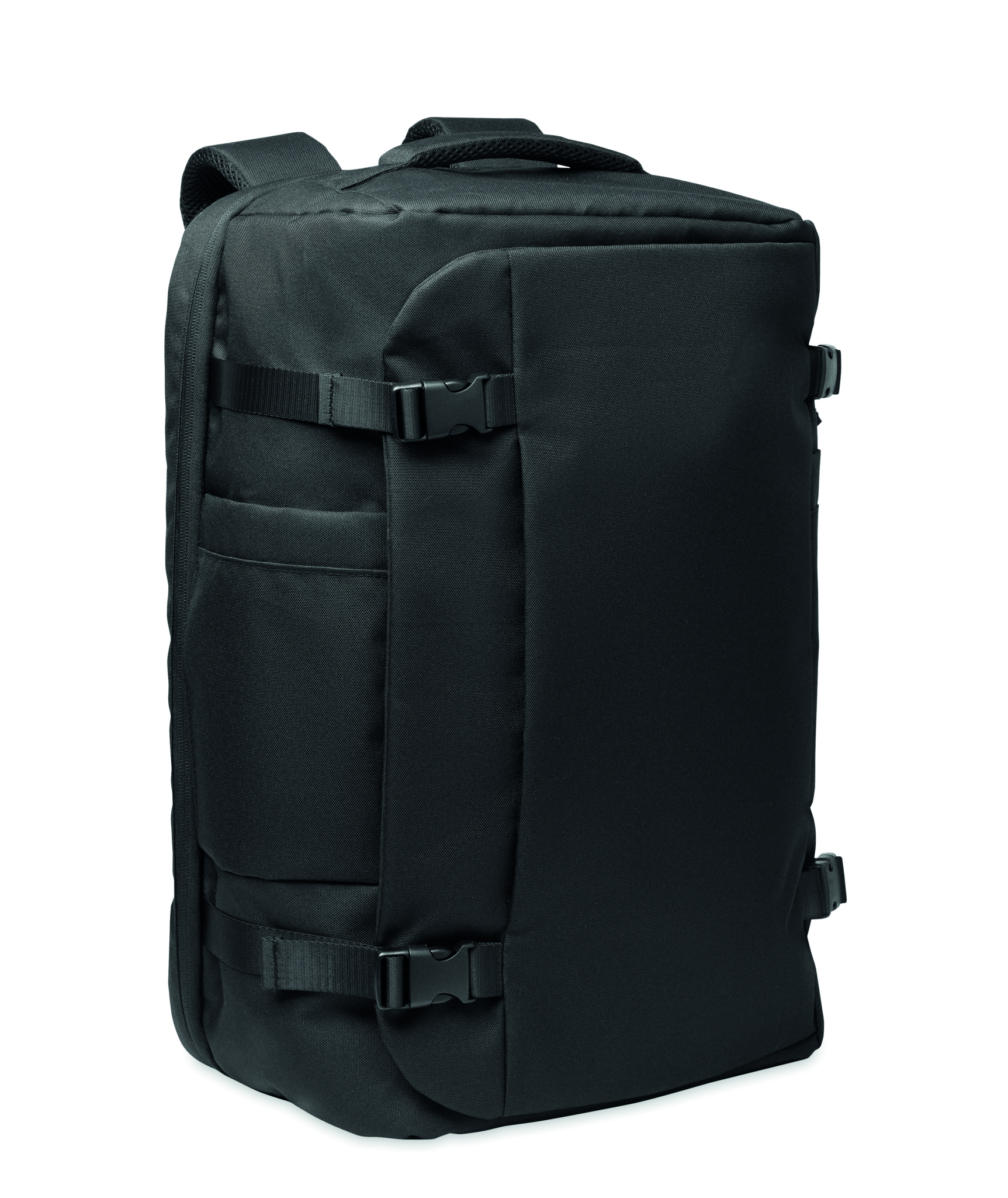 Large travel 17 inch laptop backpack in 600D RPET polyester. Features several compartments as one main for clothes, two padded for laptop, tablet and more. Padded back panel, shoulder strap, hand grip.