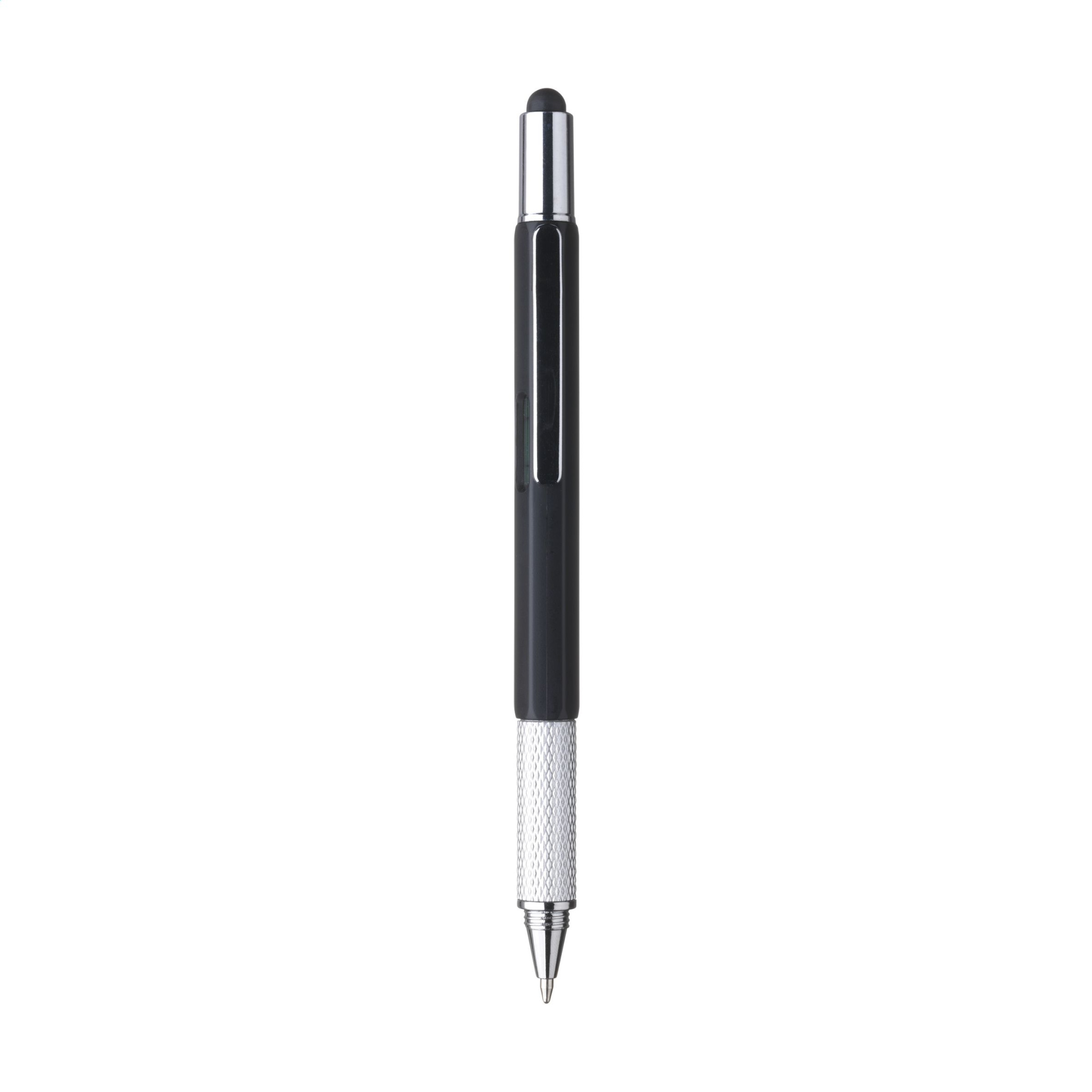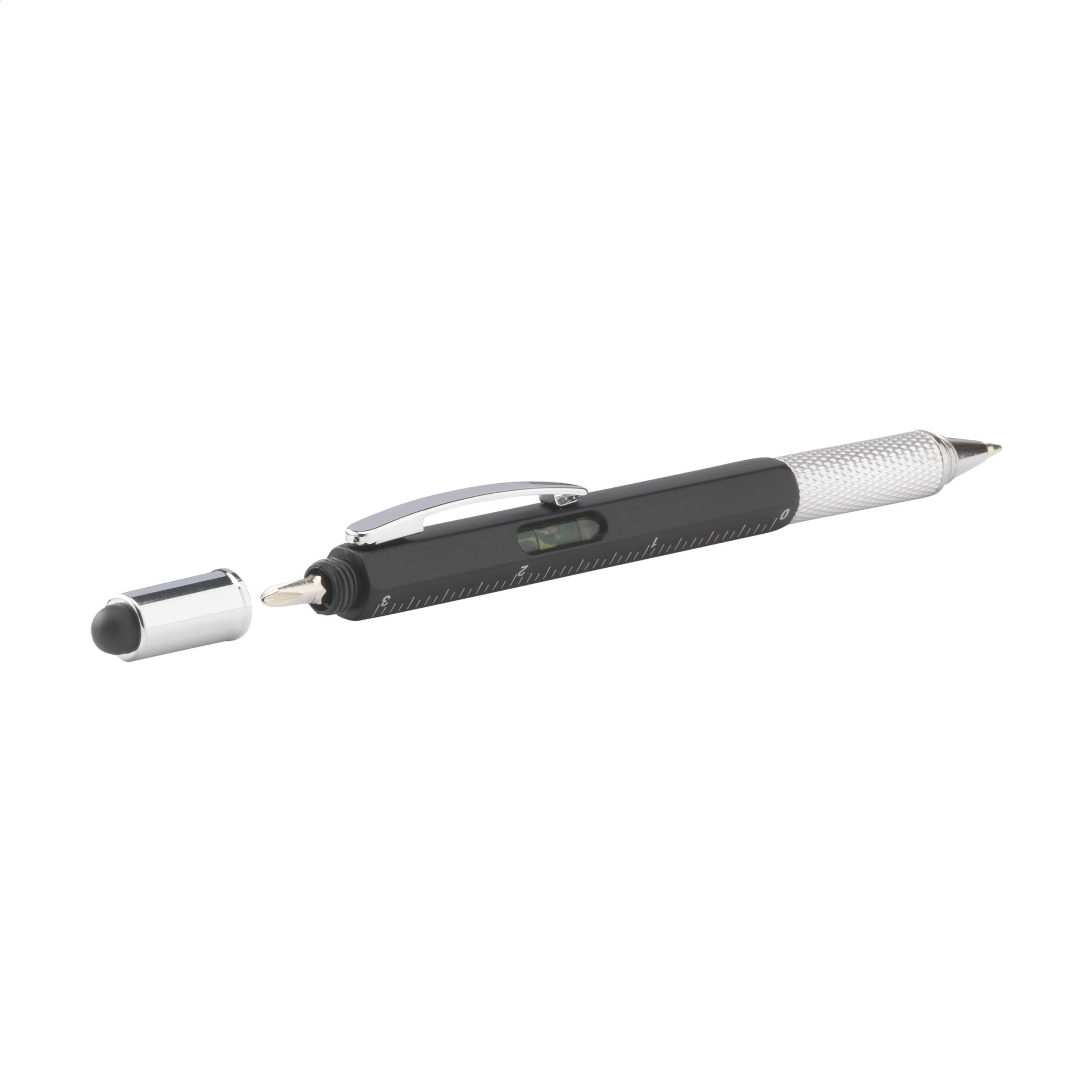 Многофункциональная шариковая ручка из материала ABS. С линейкой (7 см/3 дюйма), спиртовым уровнем, отверткой и функцией стилуса. Ручка имеет синие чернила, металлический зажим и поворотный механизм.