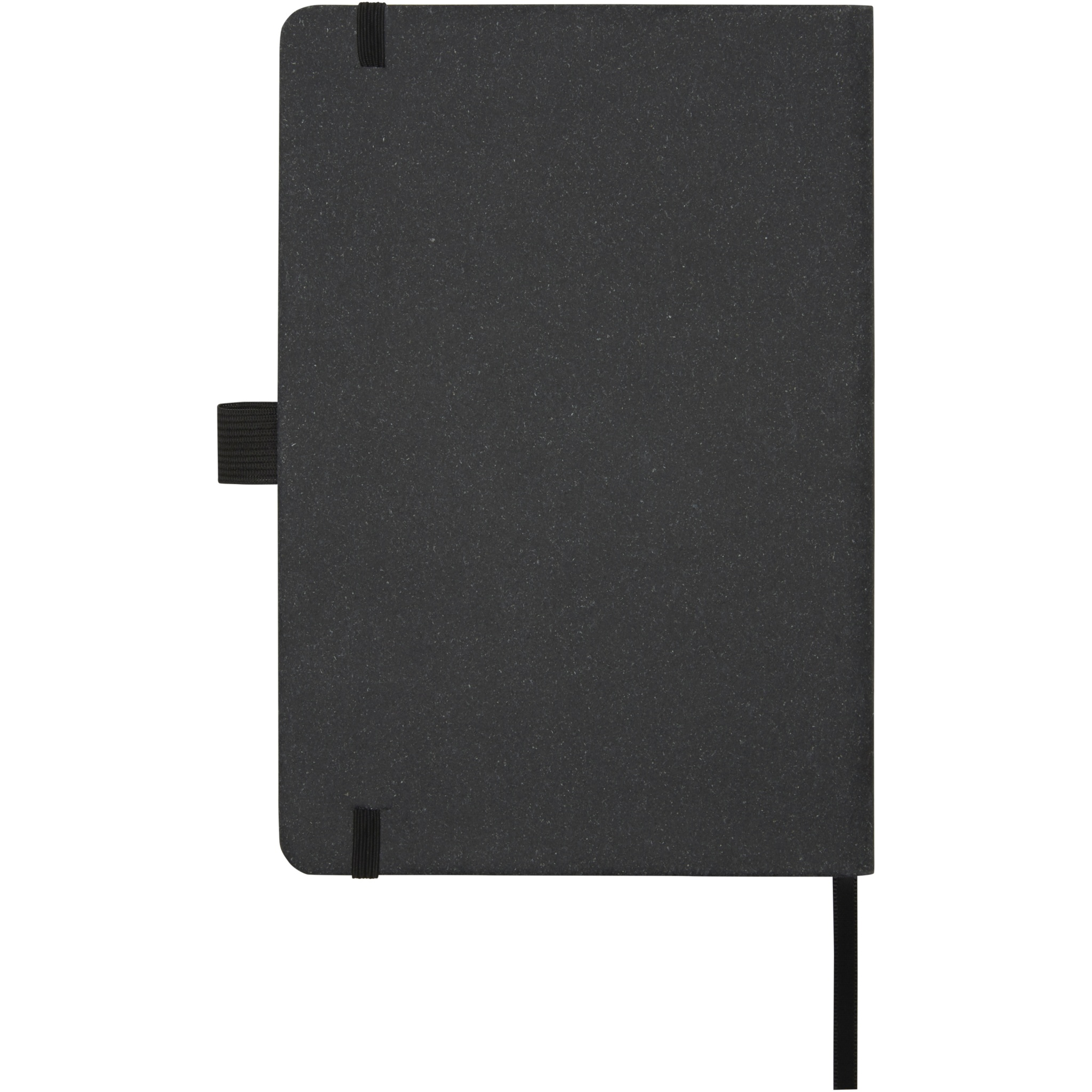 Блокнот формата А5 с бамбуковой обложкой и корешком из регенерированной кожи. 80 листов, линованная переработанная бумага плотностью 80 г/м2, черная петля для ручки, эластичная резинка и ленточка-закладка.