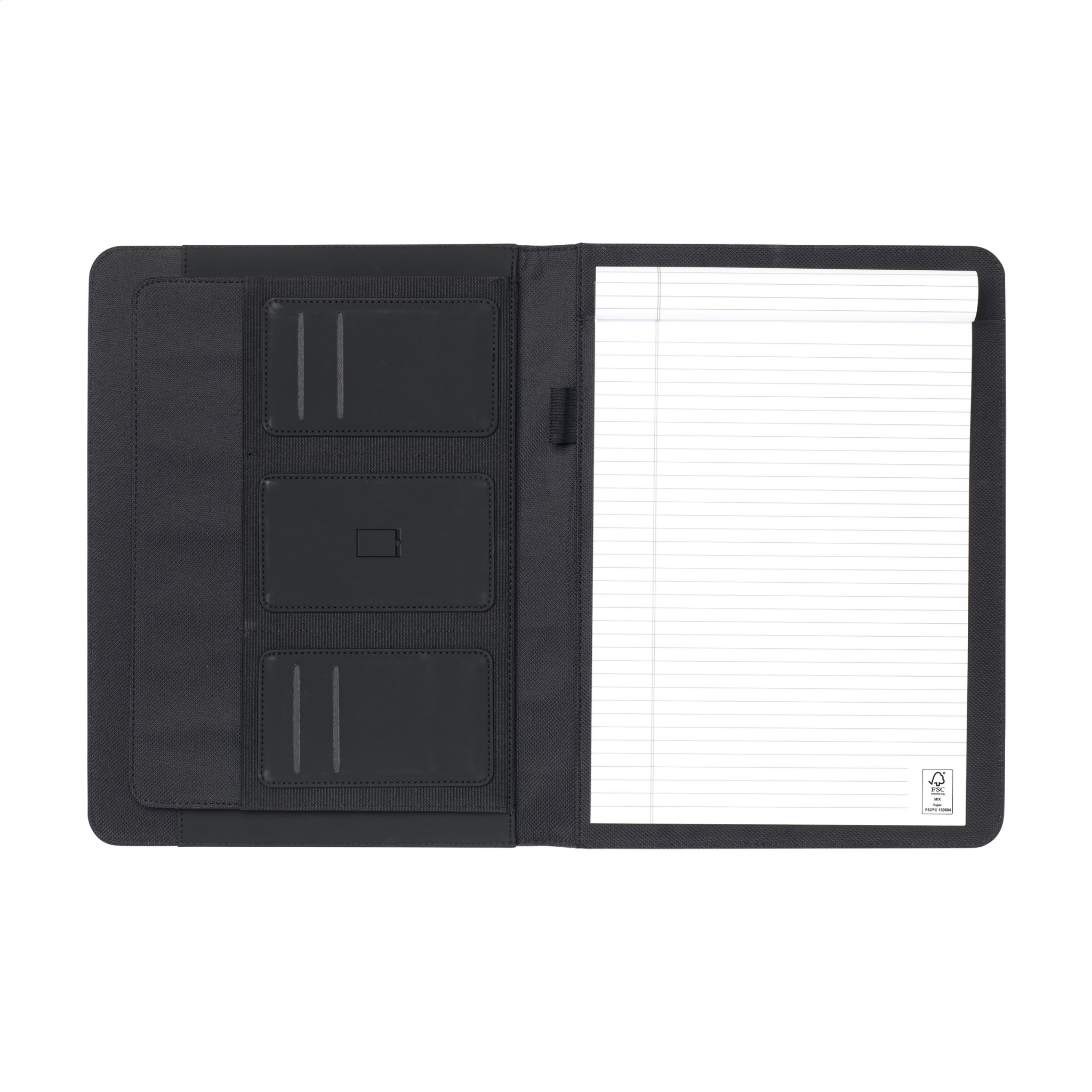 WoW! Современная папка для документов формата А4 с прочной мягкой обложкой из RPET. Внутри папки есть удобная петля для ручки и различные вставные карманы, включая отдельный отсек для хранения мобильного телефона и кредитных карт. Включает блокнот с 30 листами линованной бумаги (70 г/м²). Экологичный и экологически чистый продукт.