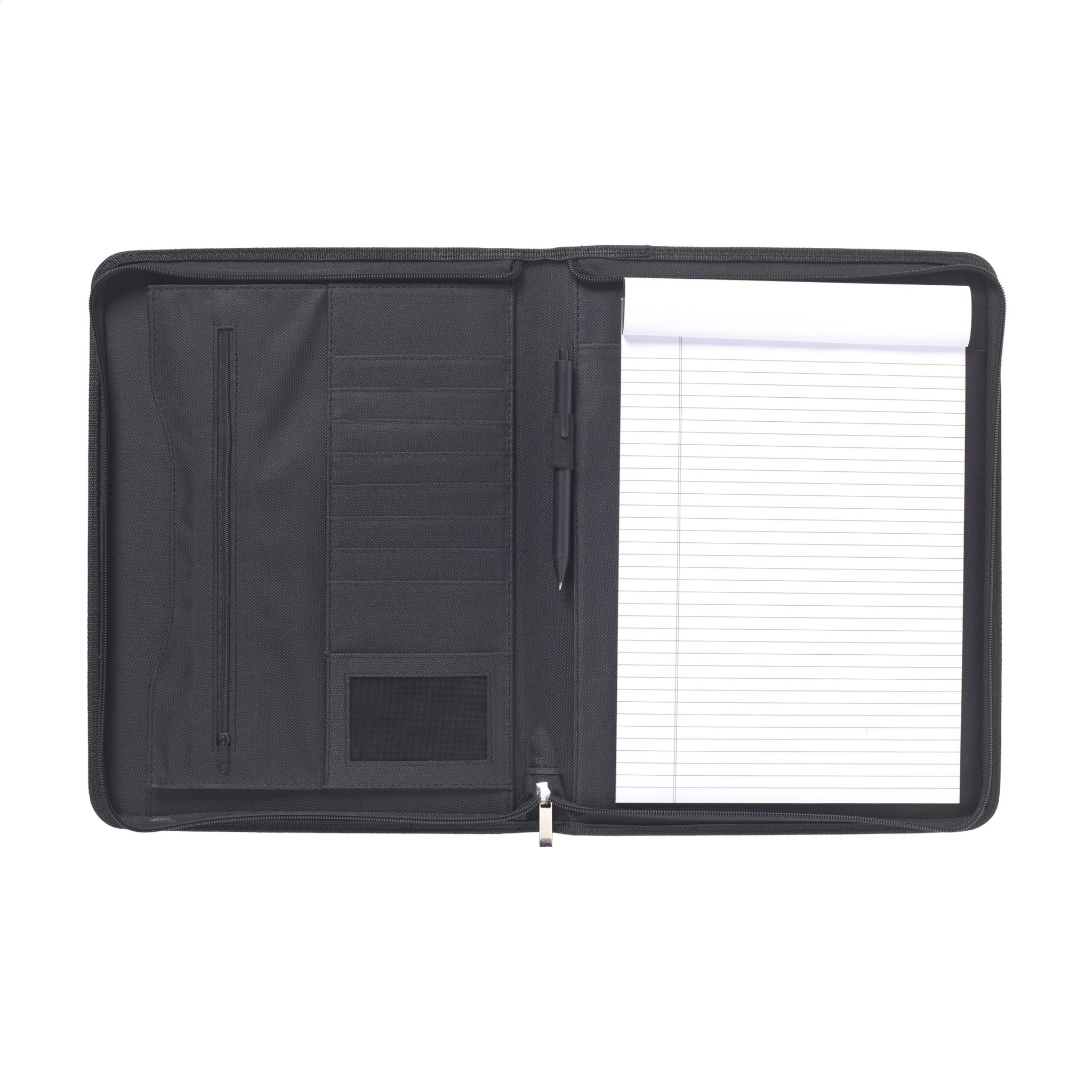 Папка для конференций/документов из высококачественной склеенной кожи формата А4. С несколькими карманами, отделениями для визиток и застежкой-молнией. Включает блокнот и шариковую ручку. Каждый предмет в индивидуальной коробке.