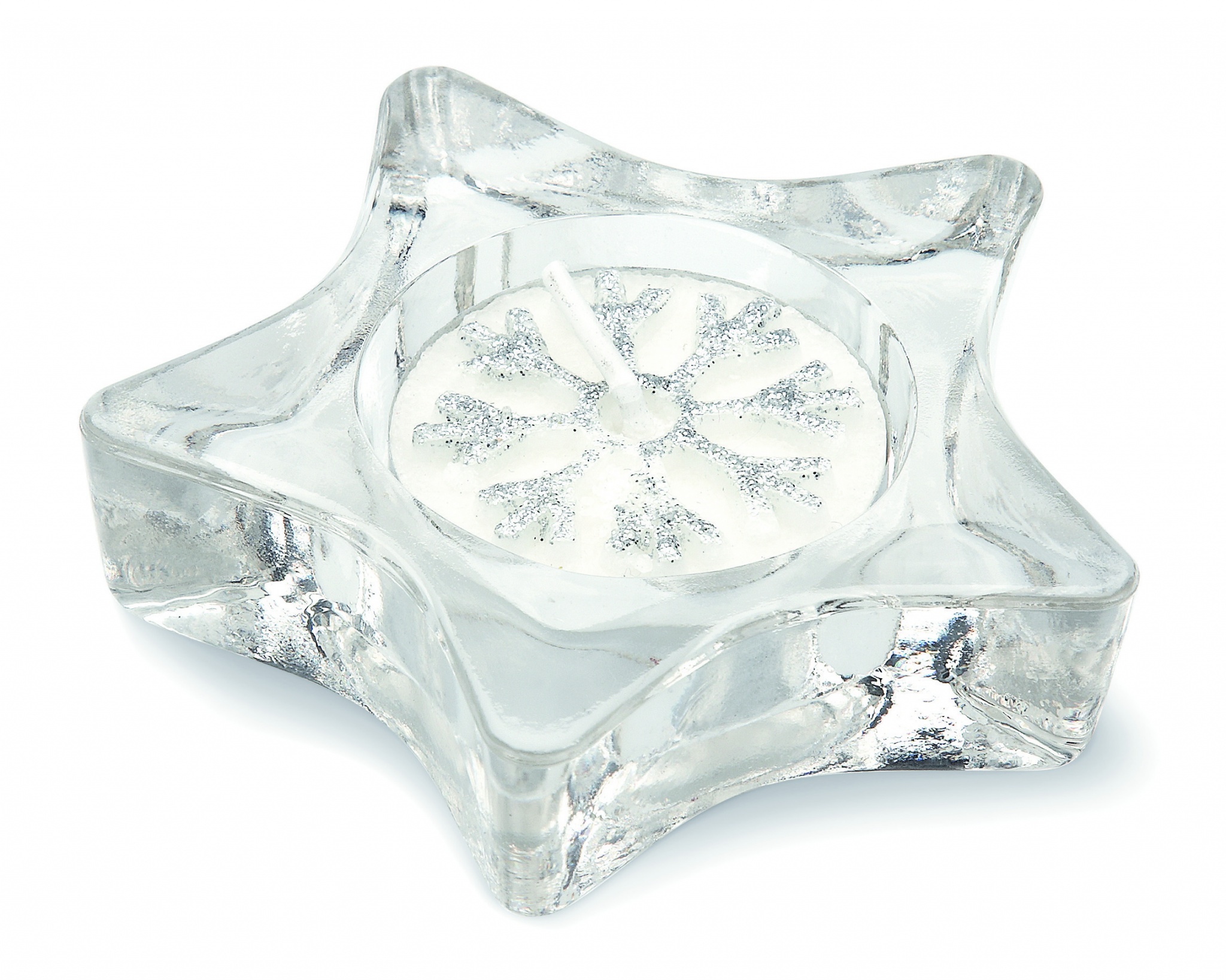 Стеклянный подсвечник со свечой в форме звезды в подарочной серебряной коробочке с прозрачной крышкой и декоративной ленточкой.