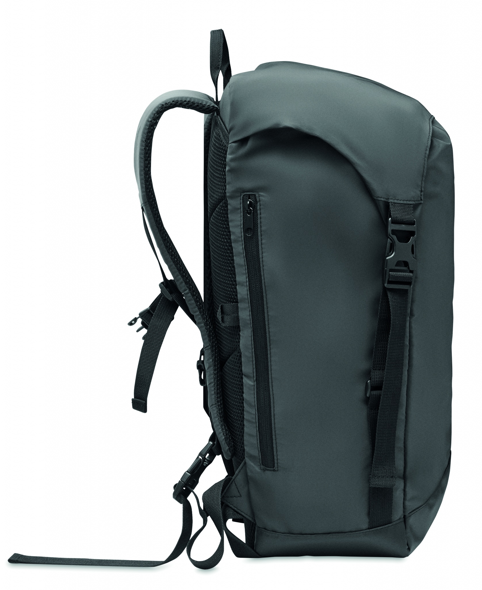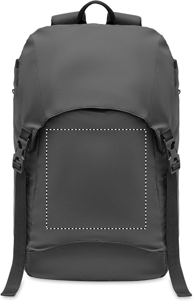 Светоотражающий рюкзак из полиэстера 190T. Боковой наружный карман на молнии и мягкая спинка, внутренняя подкладка с застежкой-шнурком. Большое внутреннее отделение для ноутбука с мягкой подкладкой. Регулируемые плечевые ремни с мягкой подкладкой, нагрудный и поясной ремни с застежкой-пряжкой. Водоотталкивающая пропитка.