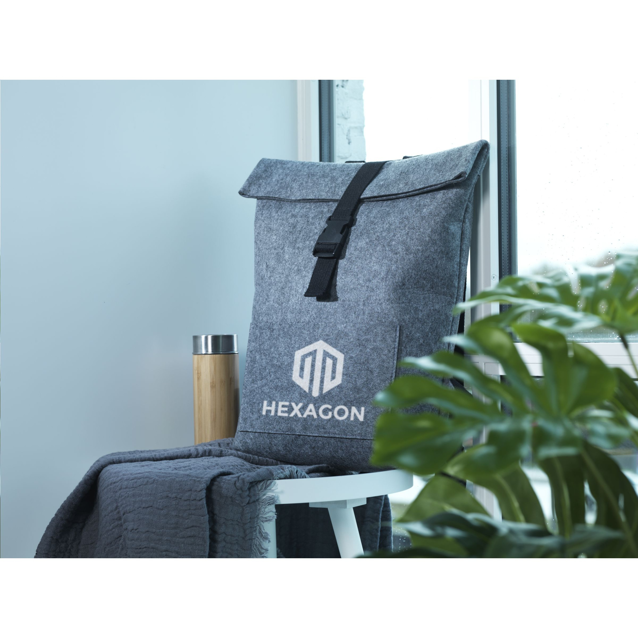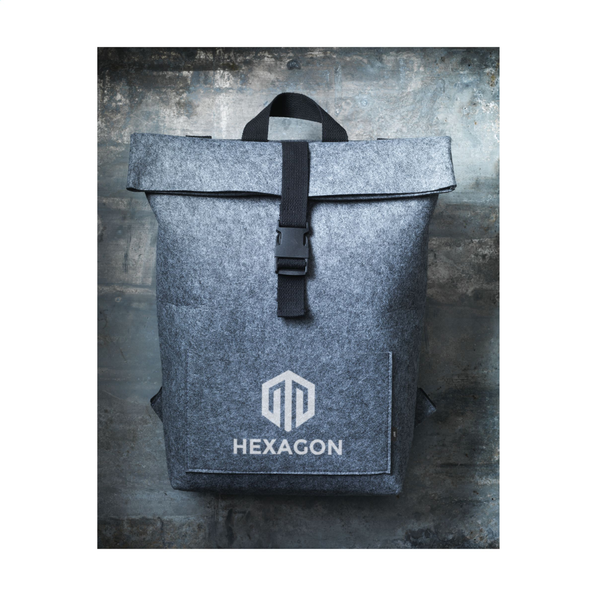 WoW! Прочный, практичный городской рюкзак с рулоном, изготовленный из прочного войлока RPET. Рюкзак имеет большое внутреннее отделение и карман спереди. С ремнем для переноски, застежкой-рулоном и удобной системой защелок сверху. Сертифицирован GRS. Общее количество переработанного материала: 80%. Емкость около 15 литров.