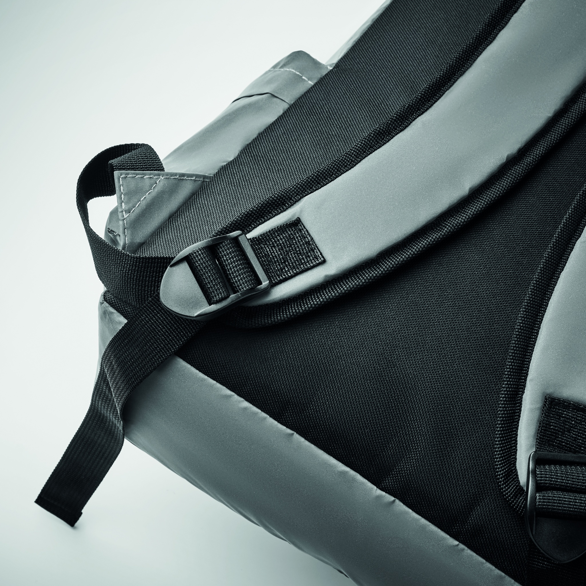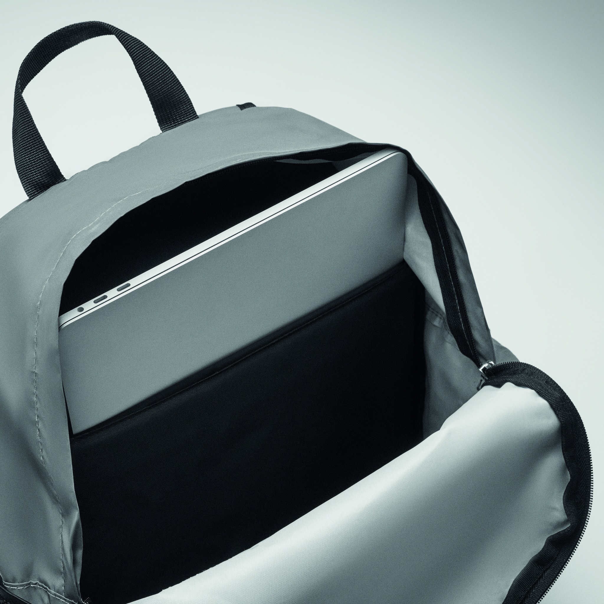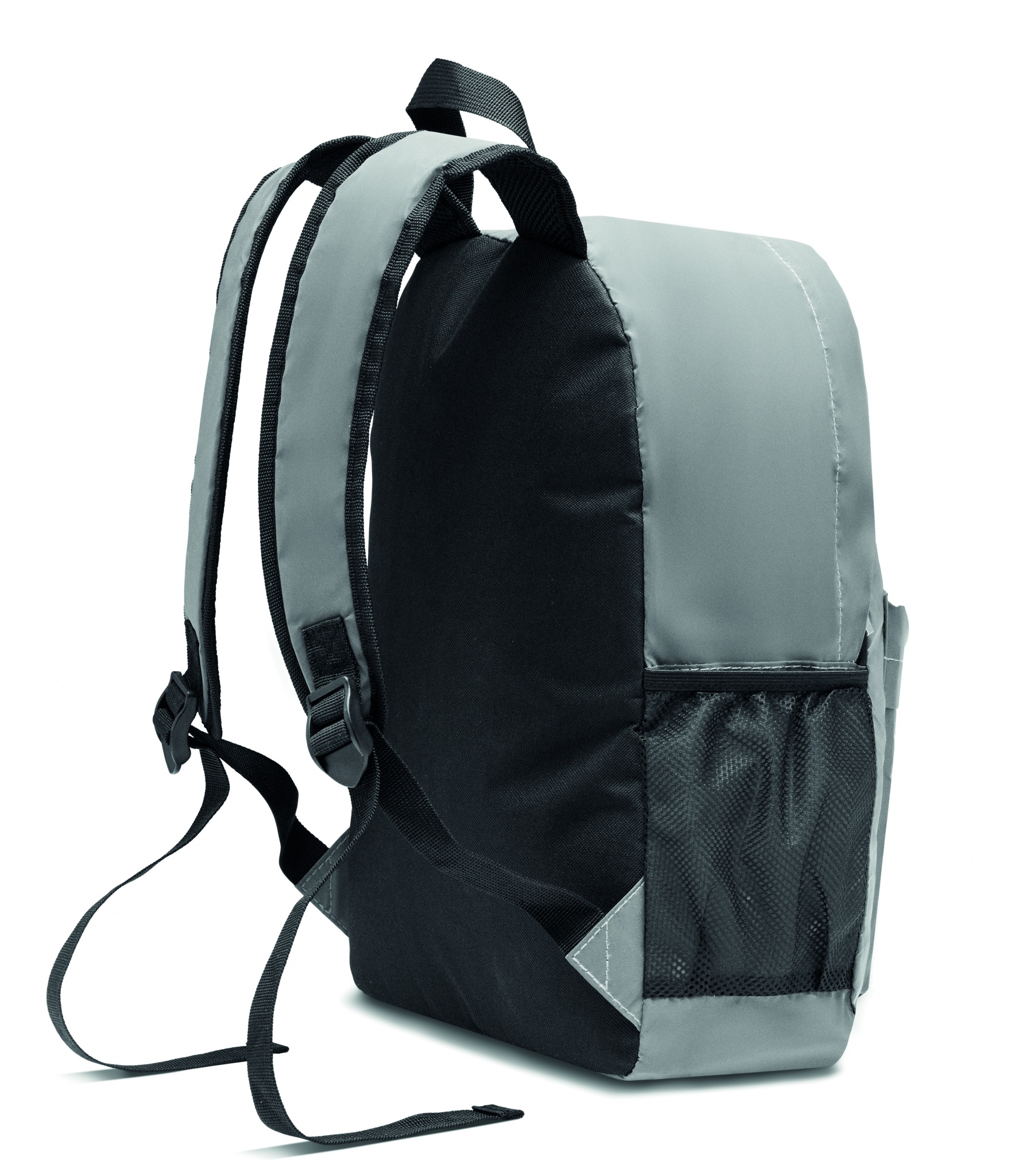 Рюкзак светоотражающий из полиэстера 190T. Имеет отделение для ноутбука 15 дюймов. Передний карман на молнии, боковой сетчатый карман и боковой карман на молнии. Для комфорта мягкая спинка из переработанного полиэстера 600D.