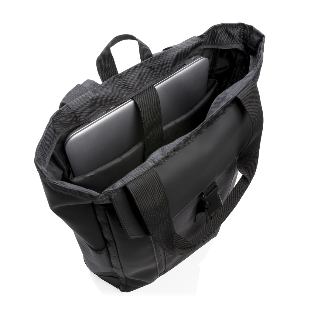 Эту универсальную сумку можно носить на плече, в руке или как рюкзак. Включает отделение для ноутбука 15" с мягкой подкладкой и защищенные RFID рукава. Не содержит ПВХ.
