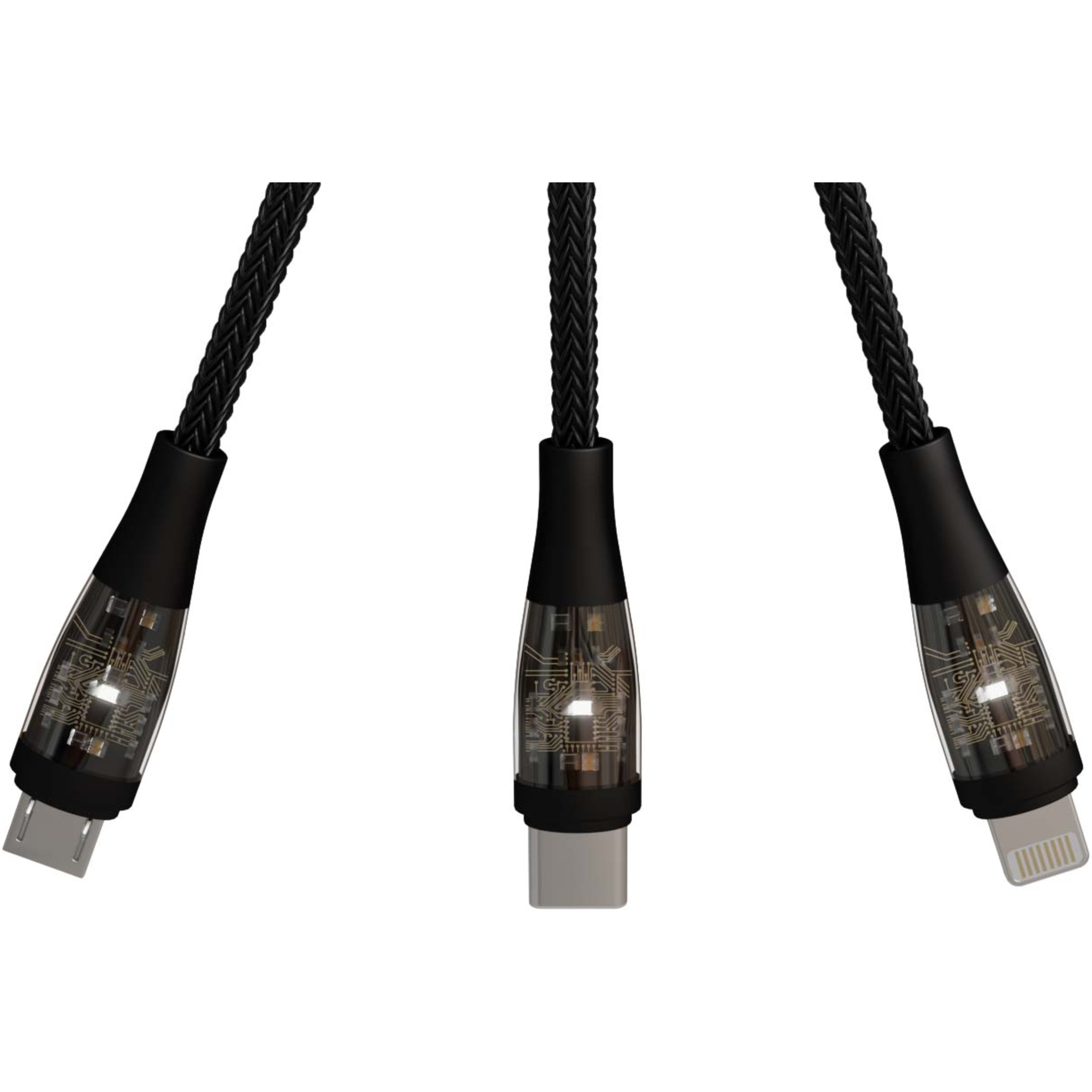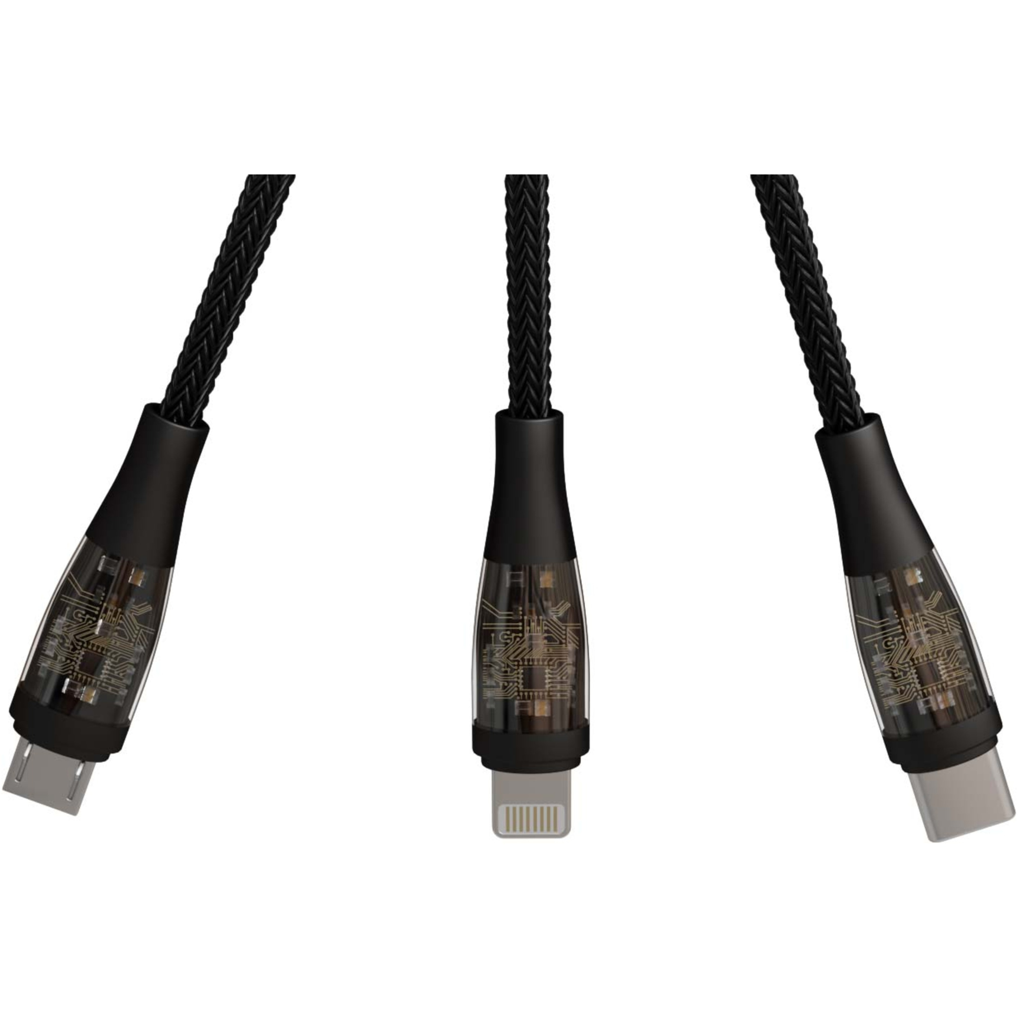 Кабель для быстрой зарядки и передачи данных 5-в-1. Входная мощность: USB-А/USB-С. Выход: Micro USB/Type-C/Lightning. Быстрая зарядка: 100 Вт/5 А. Прозрачные заглушки. Цифровой дисплей с указанием скорости передачи данных спереди и светящимся логотипом сзади.