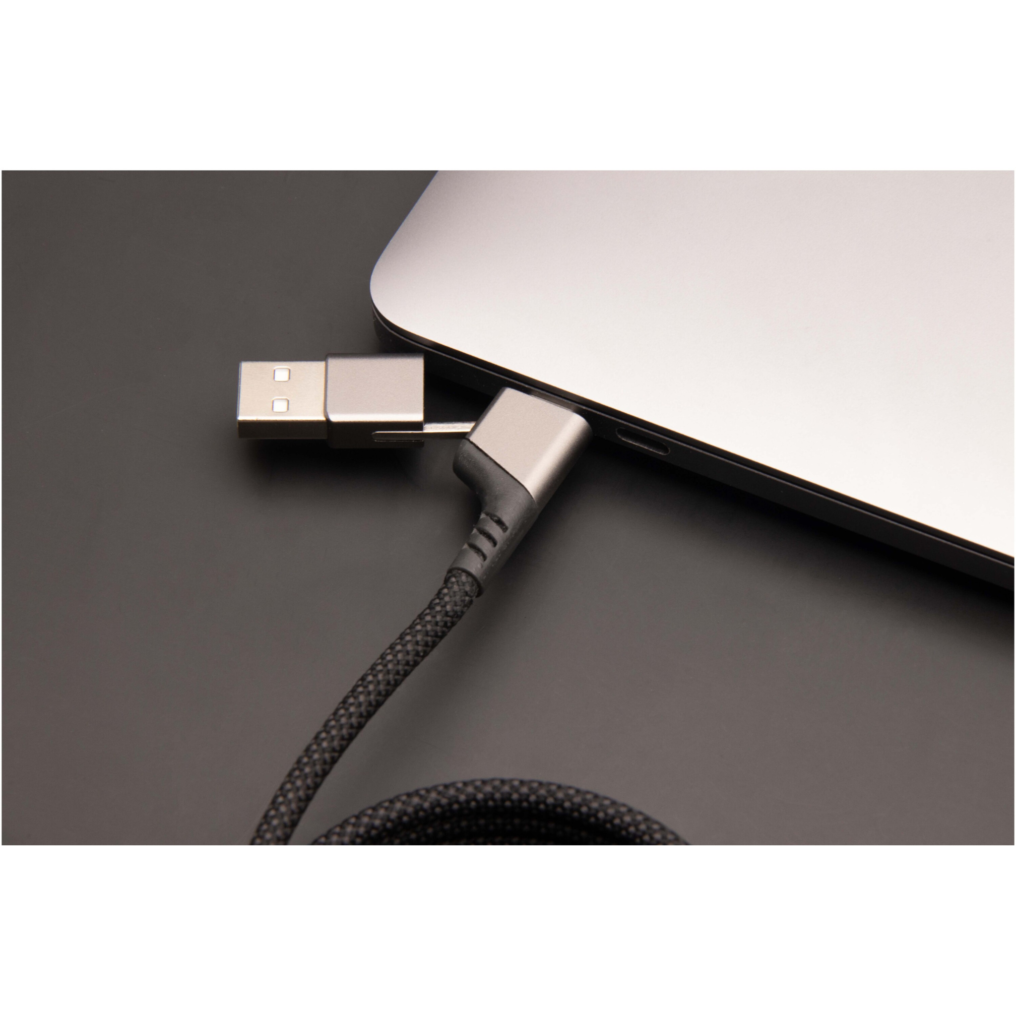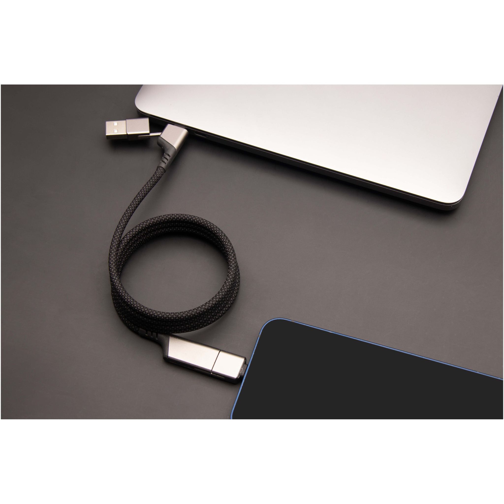 Магнитный кабель для сверхбыстрой зарядки 4-в-1, изготовленный из rPET, мощностью 100 Вт, которым можно заряжать смартфоны, планшеты и ноутбуки. Двойной вход USB-A + USB-C делает кабель на 100% совместимым с новейшими моделями компьютеров. Выходная мощность: Тип-С и Lightning. Совместимость с CarPlay. Поставляется с чехлом из перерабатываемого TPU и вкладышем, напечатанным на переработанной бумаге. Длина кабеля: 1 метр