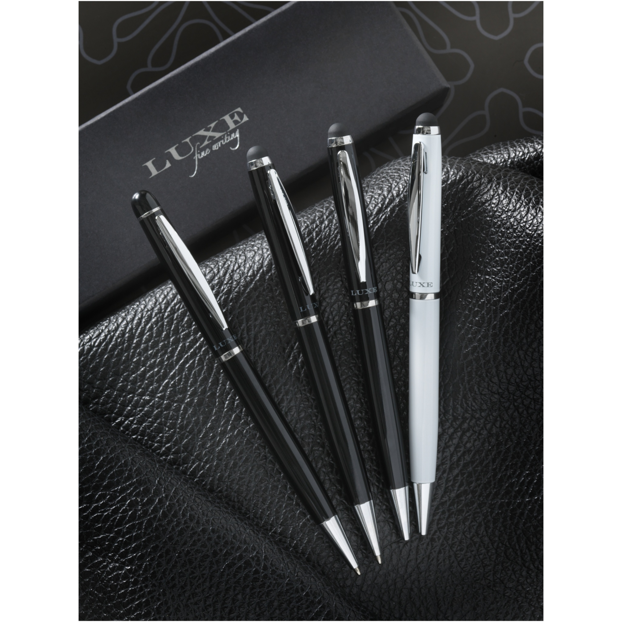 Эксклюзивная шариковая ручка-стилус с поворотным механизмом в бархатном чехле. Предлагается в подарочной коробке LUXE (размер: 17 x 3,5 x 2 см).
