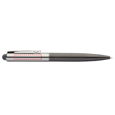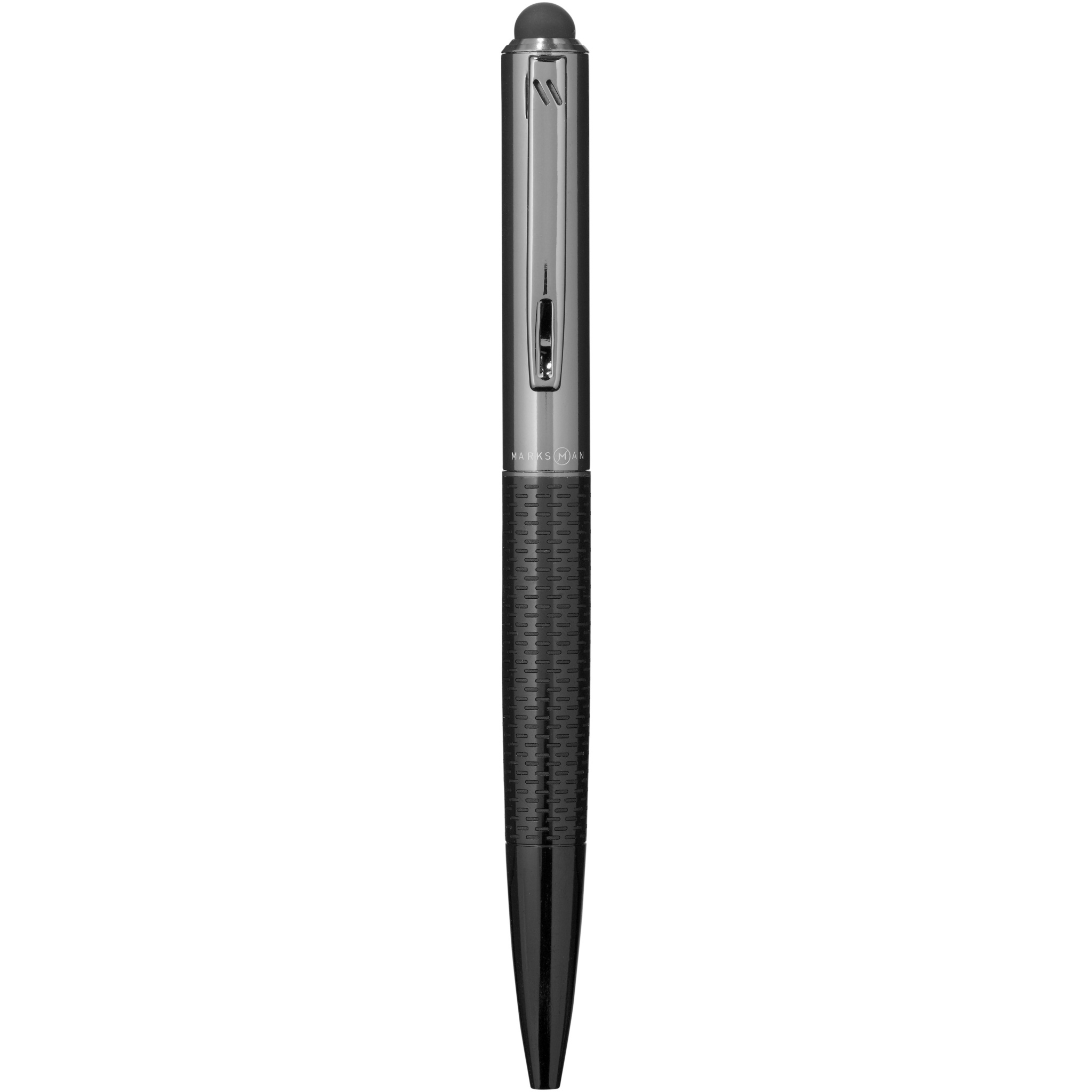 Шариковая ручка со стильным покрытием внизу корпуса. Эксклюзивный дизайн. В комплекте черный стержень высокого качества. Упакована в коробку Marksman.