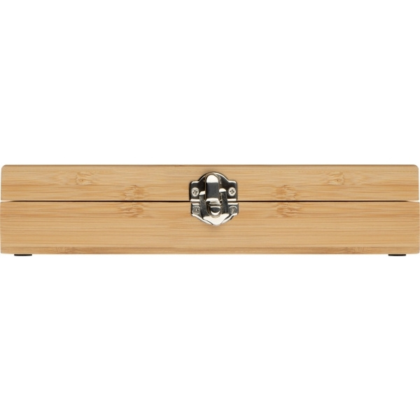 Винный набор в благородной деревянной коробке, состоящий из металлического ножа официанта, пробки для бутылки, кольца-капельницы и винного термометра. Ваш логотип будет напечатан на коробке.