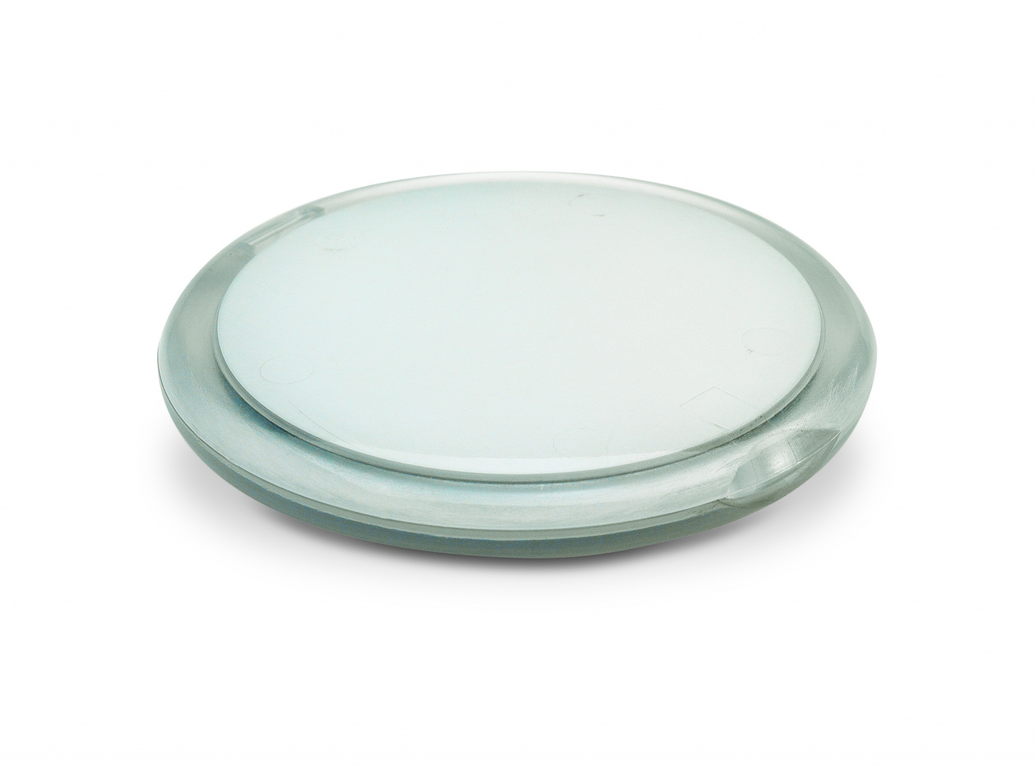 Круглое двойное зеркальце в пластиковом полупрозрачном корпусе.