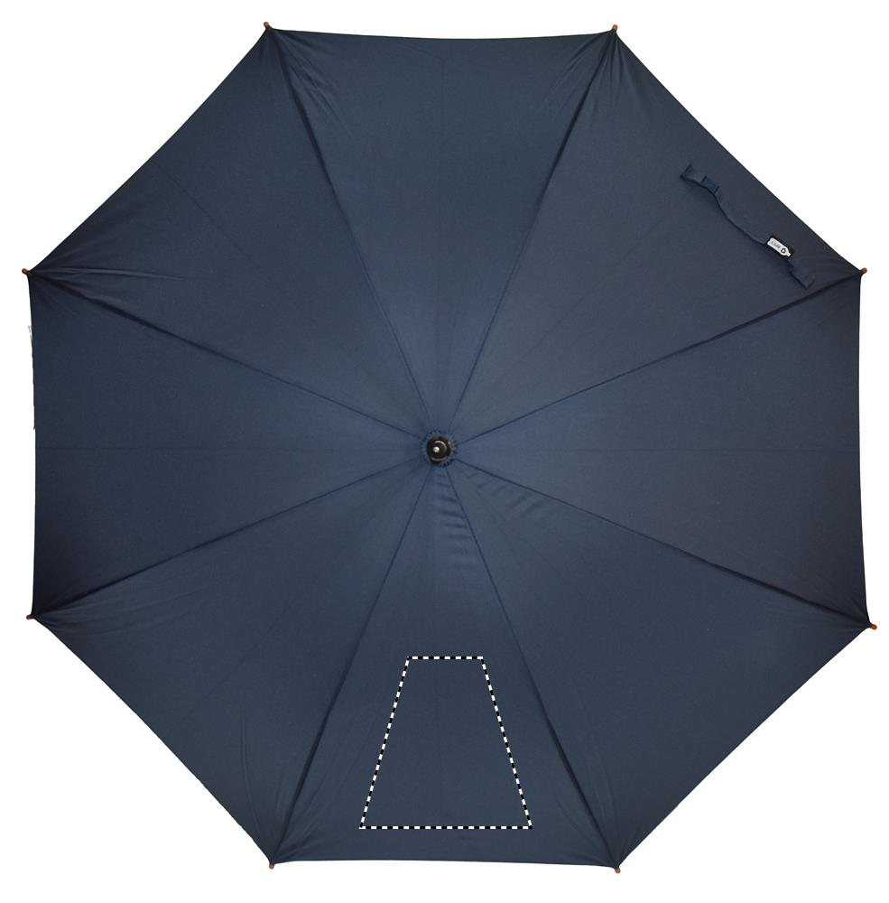 Зонт трость размером 23,5 дюйма. Материал эпонж 190T RPET. Каркас и ручка деревянные. Спицы черные металлические. Ручное открытие.