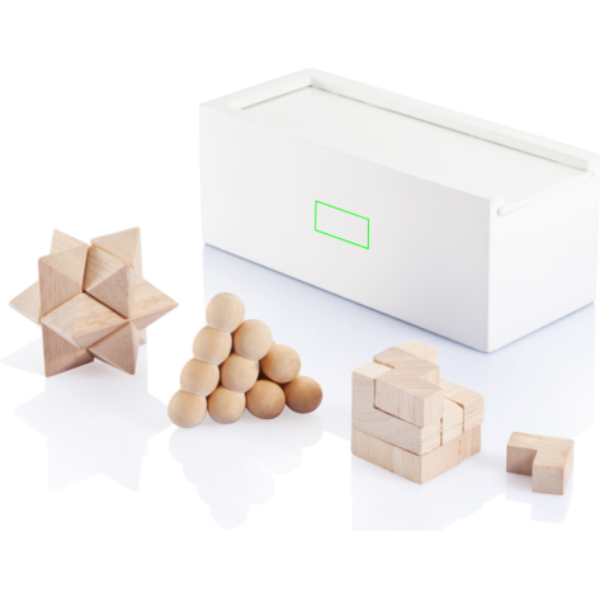Träna ditt sinne som du tränar dina muskler! Hjärngymnastik är ett roligt sätt att förbättra din analysförmåga och problemlösning. Detta set består av 3 olika pussel och levereras i en vitmålad furulåda. Tillverkat av FSC® certifierat trä. Levereras i FSC® certifierad kraft förpackning.