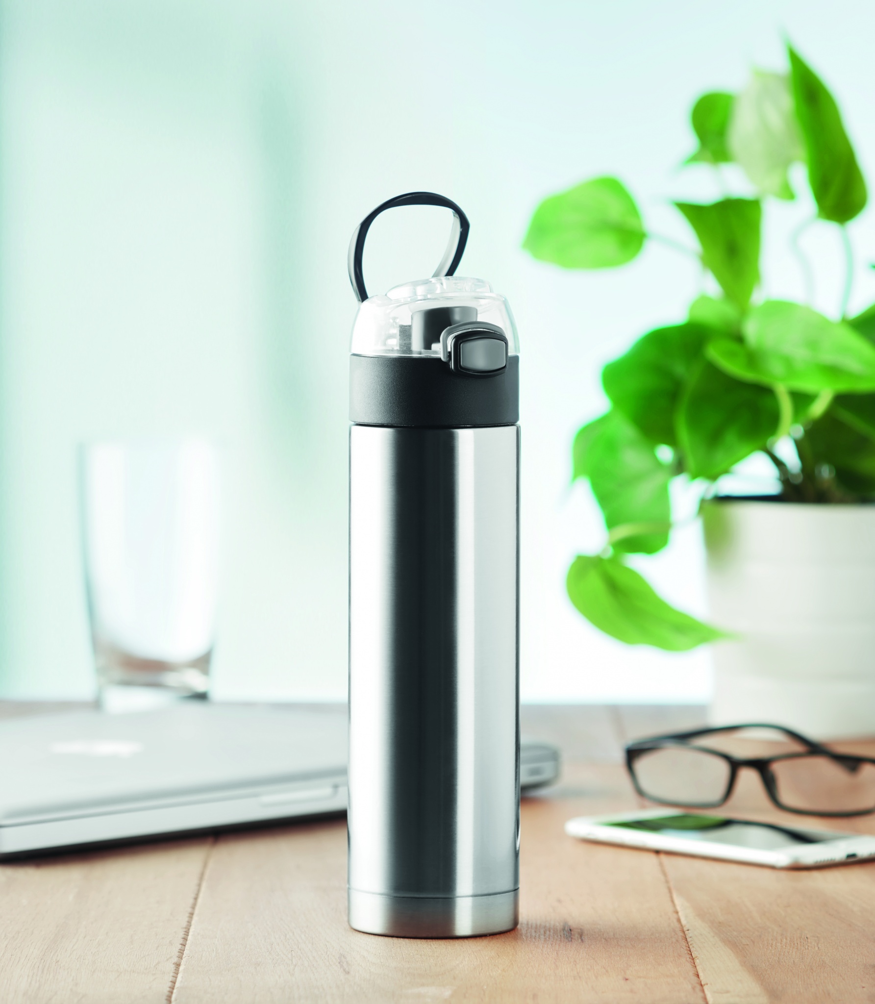 Dricksflaska med isolerande dubbelvägg i rostfritt stål och läckagefritt förslutningslock. Locket har en extra säkerhetsbygel för att hålla det på plats. Handtaget på toppen kan vikas upp om du praktiskt vill hänga flaskan på något. Vattenflaskan rymmer 400 ml och är 100 % läckagefri. Läckagefritt.