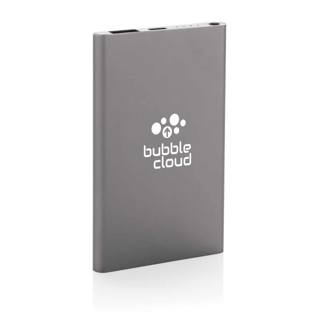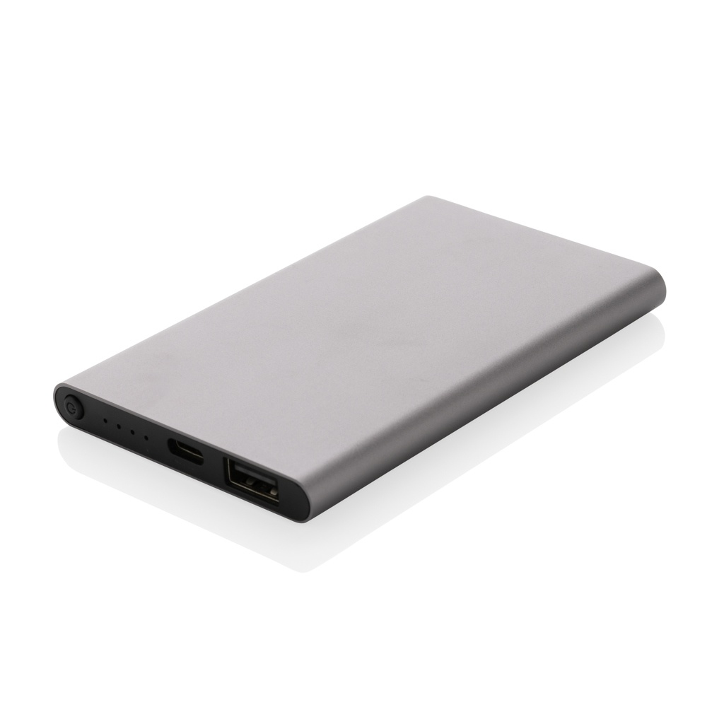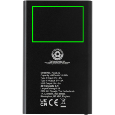 4.000 mAh powerbank med platt design där höljet är tillverkat av RCS-certifierad återvunnen aluminium/ABS-plast. RCS (Recycled Claim Standard) certifiering säkerställer en helt certifierad leveranskedja av de återvunna materialen. Totalt återvunnet innehåll: 36% baserat på total produktvikt. Powerbanken stöder både laddning via USB A och type C. Powerbanken innehåller ett 4.000 mAh litiumpolymerbatteri av klass A med lång livslängd. Strömindikatorerna visar den återstående energinivån så att du alltid vet när du behöver ladda om.; Type C-input 5V/2A; Type C-output: 5V/2A USB A-output: 5V/2A. Produkt och tillbehör är PVC-fria. Laddningskabel i RCS-certifierad återvunnen TPE medföljer. Levereras i FSC® mix-förpackning.